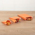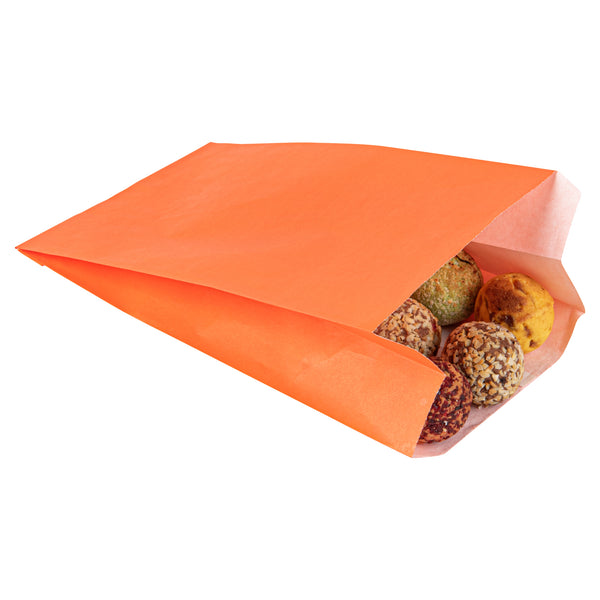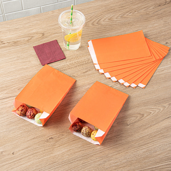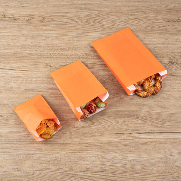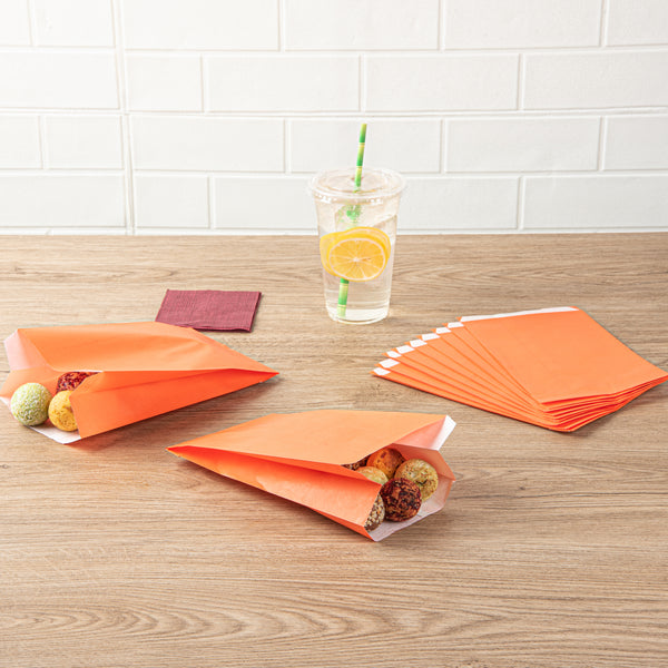 Make snacking a bright and vibrant affair with our Bag Tek Tangerine Orange Paper French Fry / Snack Bags. These French fry bags feature an open-pouch style that ensures easy packing and provides customers with quick access to their beloved finger foods. To prevent oils from leaking and causing messes, these snack bags are greaseproof. The lively orange finish of these goodie bags brings a cheerful vibe to your food presentation and complements your tableware. These treat bags are disposable for a stress-free cleanup. Each orange snack bag measures 5 inches in length by 3 inches in width by 8.7 inches in height. Shipped in 100 count box.