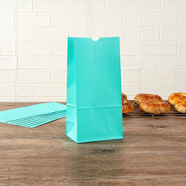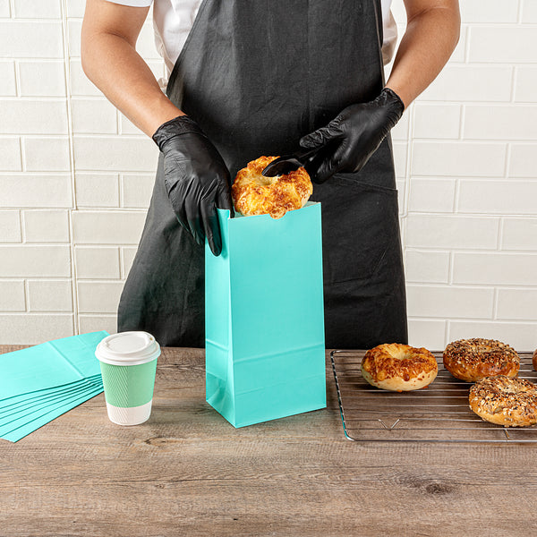 Maintain pristine presentation with grease-resistant bakery bags. Bag Tek Grease-Resistant Bakery Bags feature a robust paper construction that ensures reliability for carrying baked goods and takeout meals, enhancing the operational efficiency of foodservice establishments. These takeout paper bags boast a vibrant turquoise color that draws customer attention, elevating your brand's presentation and appeal. With an 8-pound capacity and dimensions of 6 inches by 4 inches by 11.8 inches, these bags provide ample space for packaging a variety of items without being cumbersome. The flat bottom design offers upright stability, making it perfect for secure packaging of snacks and pastries. The open-top design also allows for easy access, ensuring customers can conveniently enjoy their meals. Ideal for bakeries and cafes, these grease-resistant bags prevent unsightly oil splotches, maintaining a clean and professional look for your business. Each order includes 100 Bag Tek Grease-Resistant Bakery Bags.