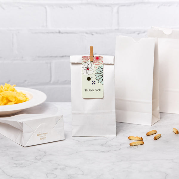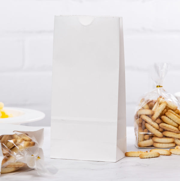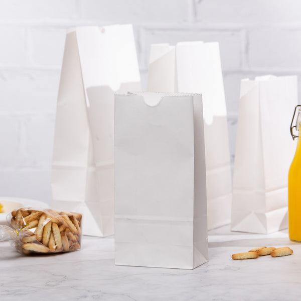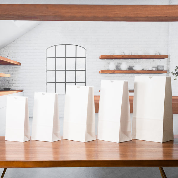 Our Bag Tek White Paper Bags make it easy to take pastries home with you. Designed with flat bottoms, these kraft paper bags stand up by themselves on tabletops so you can comfortably package food. Featuring an open top, these merchandise bags can be rolled down to securely contain sandwiches during deliveries. Made from premium paper, these retail bags are tear-resistant to prevent any spills while on the go. The classic white finish of these paper lunch bags gives your presentations a traditional and versatile look. These recyclable paper bags are 4.33 inches long by 2.36 inches wide by 8.66 inches long and contain up 2 pounds of small pies. Sold in a 100 count box.