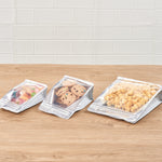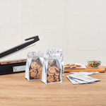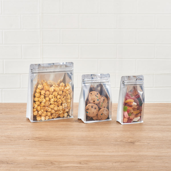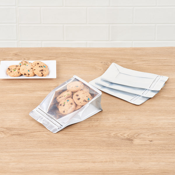 Leave a great impression on your customers with our Bag Tek White Plastic Medium Snack Bags. These storage bags have a double sealing facility, heat-seal and feature a rip-lock closure to ensure the food inside always remains fresh. Impermeable to humidity and moisture, these snack bags are airtight. These plastic pouches are also leakproof and greaseproof to not damage clothes and furniture with oil spills. With side gussets, these zip-lock bags can hold a substantial amount of snacks like seeds, candies, coffee beans, biscuits, chocolates, and many more. These plastic pouches for dry foods are made with high-quality plastic, making them sturdy and durable. The white finish of these plastic storage bags can complement other boxes and containers in the pantry. Each snack bag measures 8 inches in length by 5 inches in width by 3.25 inches in height. Sold in a 100 count box.