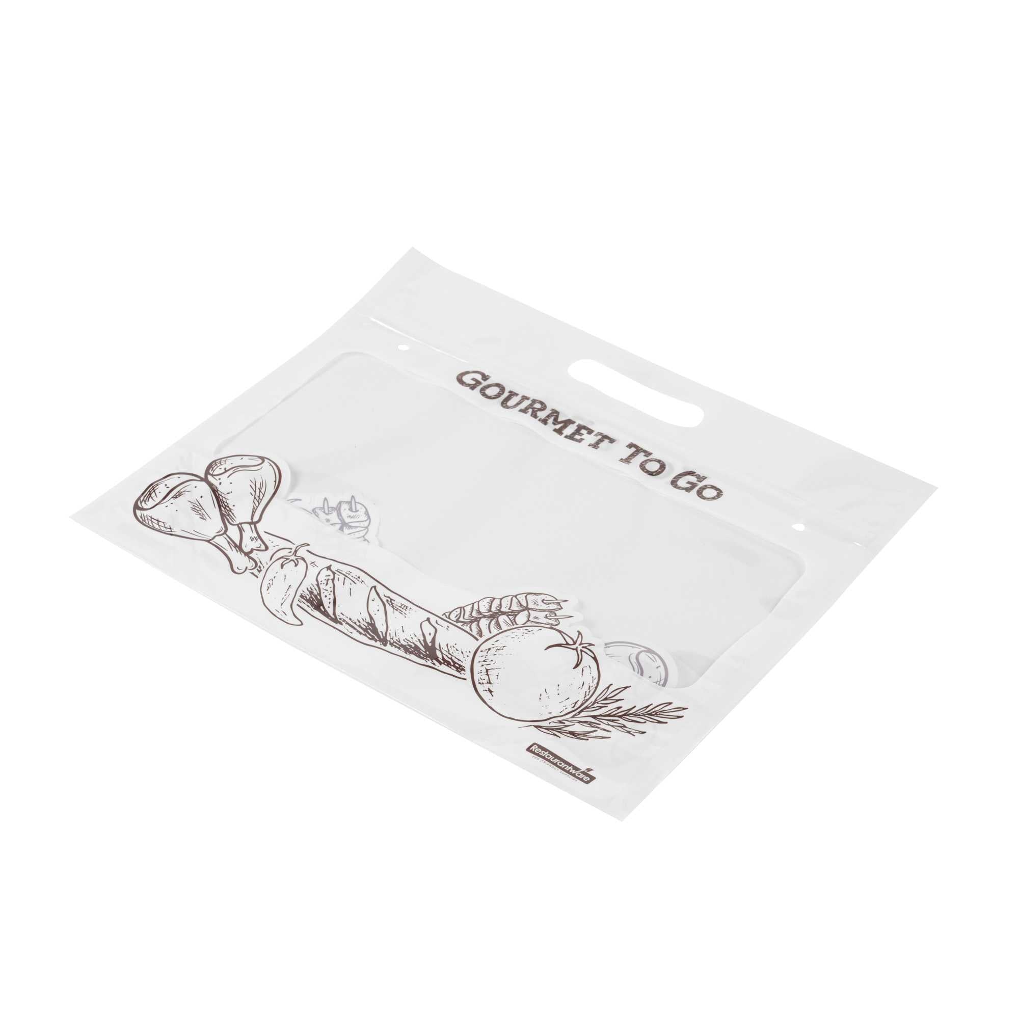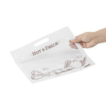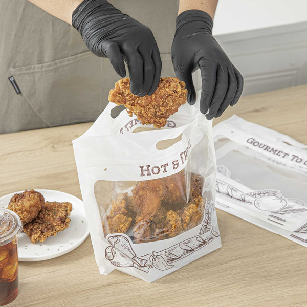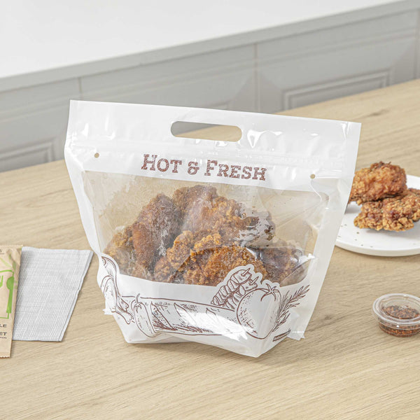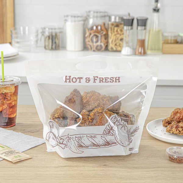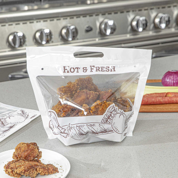 Securely package your hot-from-the-oven rotisserie chicken with our Bag Tek White Plastic Rotisserie Chicken / Hot Food Bags. With an in-built ability to retain heat and maintain food temperature whilst being transported, these hot delivery bags are a prime pick for delis, self-service restaurants, and informal dining spots. These hot food bags have a clear window at the front for simple food identification and tiny vent holes that allow steam to vent out. Ideal for holding rotisserie chicken or baked turkey, these food-carrying bags have robust handles. These rotisserie chicken bags enable an uncomplicated opening with the help of a zip mechanism and immediate resealing to retain the freshness of hot foods. Made from top-notch plastic, these food delivery bags are both greaseproof and leakproof, preventing possible spillage or mess. Exhibiting a sophisticated white hue, these food storage bags enhance the visual appeal of your food. These plastic bags are microwave-safe to enable effortless food reheating. Measuring 12.75 inches long by 5.75 inches wide by 10.25 inches high, these bags can comfortably hold hefty portions of chicken wings, ribs, roast turkey, and various other dishes. Shipped in a 100 count box.