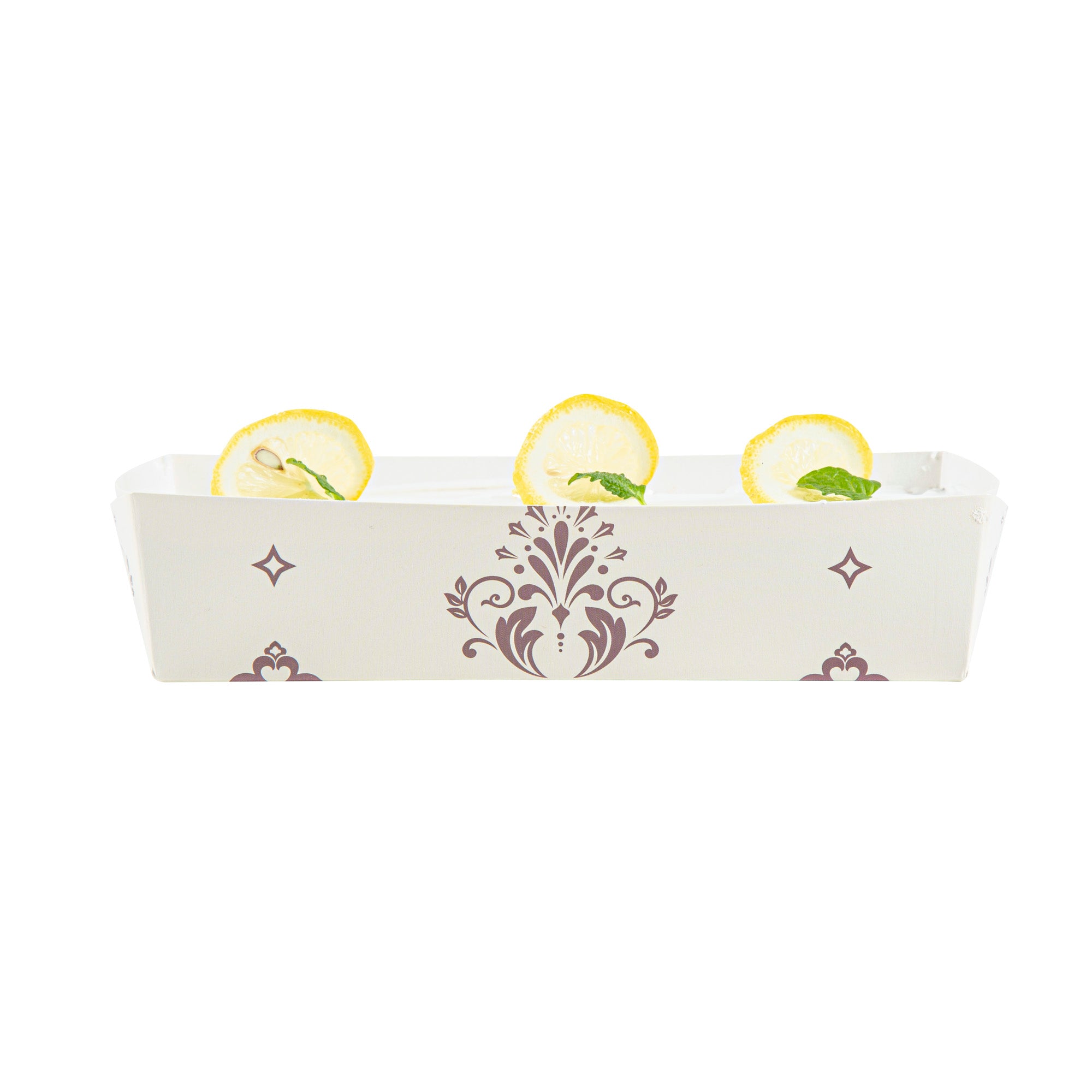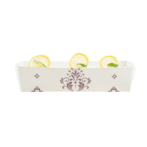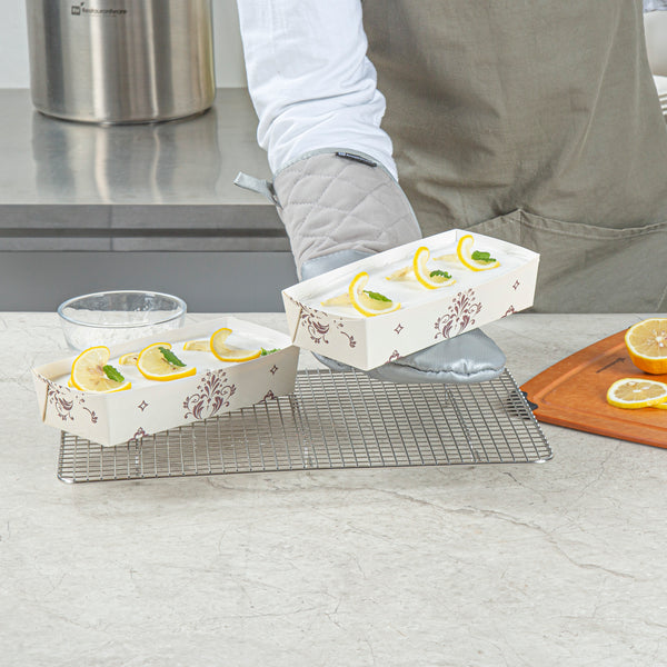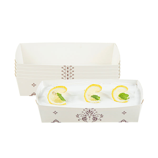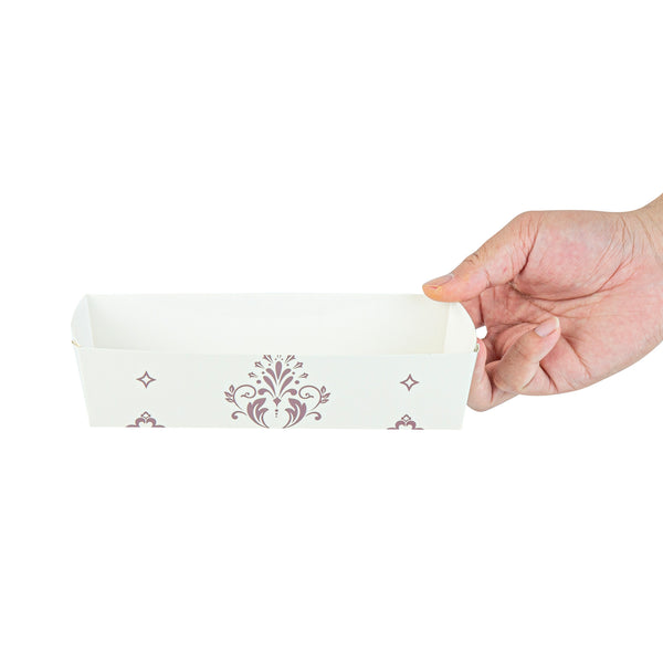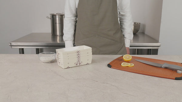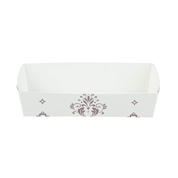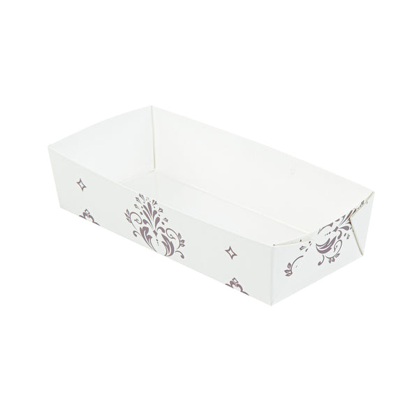Bake to perfection with reusable convenience. The Bake Tek Grease-Resistant Oven-Safe Baking Tray, crafted from sturdy paper, resists warping at temperatures up to 390F, ensuring consistent baking results for your quick breads or pound cakes. This disposable baking tray is grease-resistant, preventing leaks and maintaining the elegant presentation of your treats, making it an essential tool for any bakery or cafe. With its 7.8-inch by 3.6-inch size, this oven-safe baking mold offers versatility as it is freezer and microwave safe, accommodating a range of food preparation needs. The charming beige color with a floral background and white interior seamlessly blends with any decor, adding an attractive touch to your displays. Enhance your bakery’s efficiency and aesthetic appeal with this paper loaf pan. Each order includes 100 Bake Tek Grease-Resistant Oven-Safe Baking Trays.