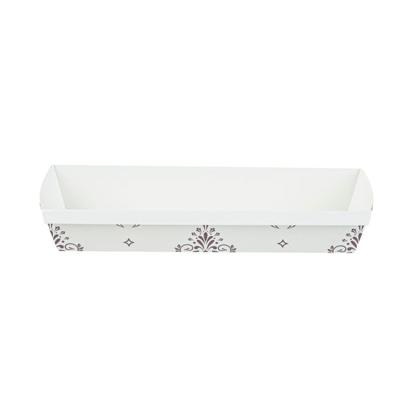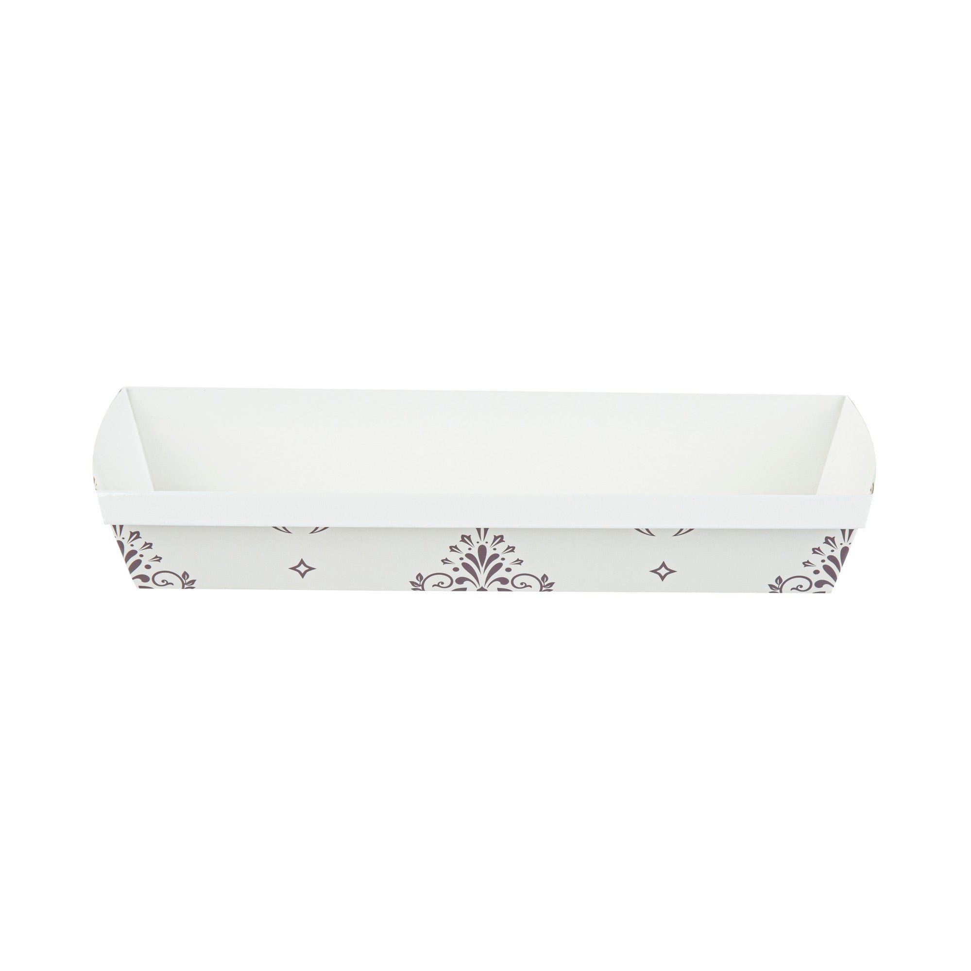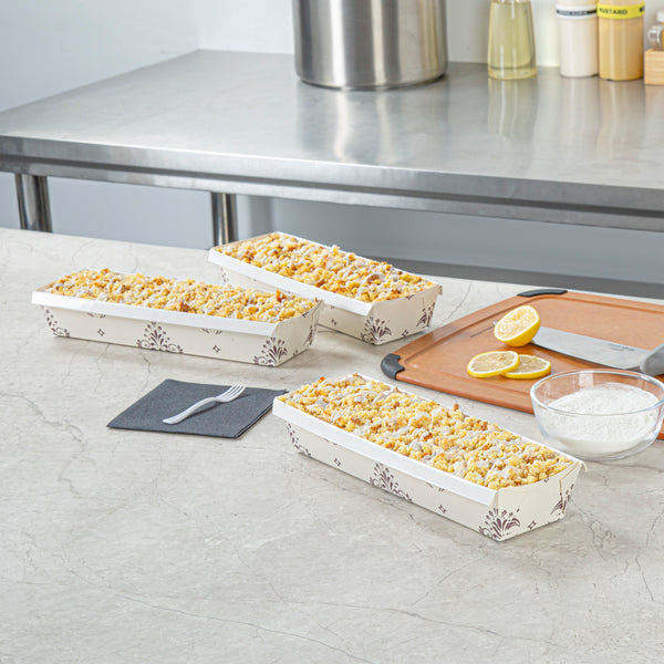 Elevate your baking service with stylish presentation. The Bake Tek Paper Loaf Pan combines a greaseproof paper construction with an elegant vintage floral design, making it an ideal choice for artisanal bakeries and upscale events. Featuring a 32-ounce capacity, this paper loaf pan accommodates medium-sized loaves, perfect for a variety of recipes. Its oven-safe design withstands baking temperatures up to 390 degrees Fahrenheit, ensuring consistent performance without warping, while the greaseproof surface enhances the presentation of quick breads and cakes. Additionally, this rectangular paper loaf pan is freezer safe, allowing for convenient pre-prep and storage, aligning with efficient foodservice operations. The disposable bread pan is eco-friendly, making it easy to serve and dispose of, catering to sustainable practices. Enhance your bakery's efficiency and aesthetic appeal with this essential bakeware solution. Each order includes 100 Bake Tek Paper Loaf Pans.