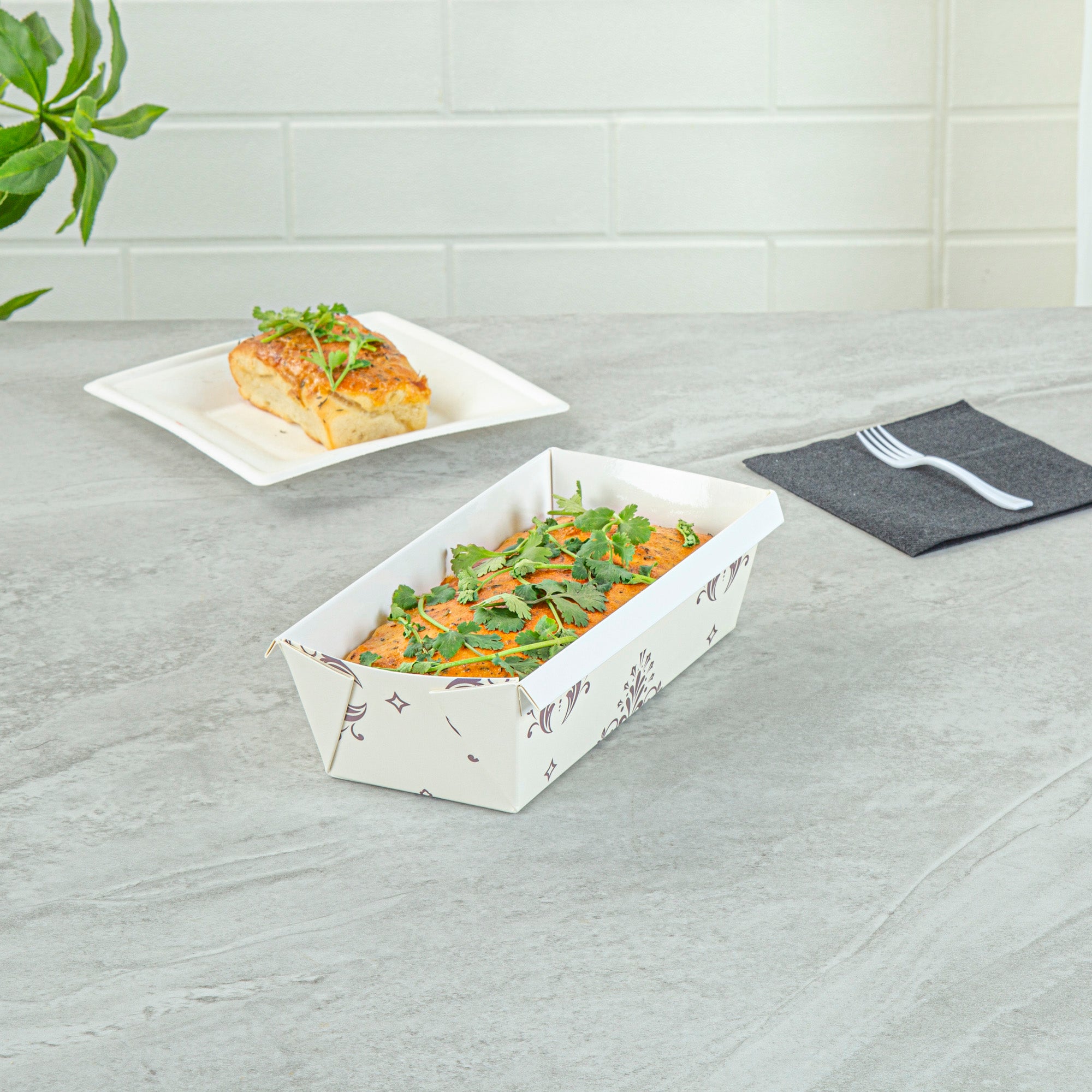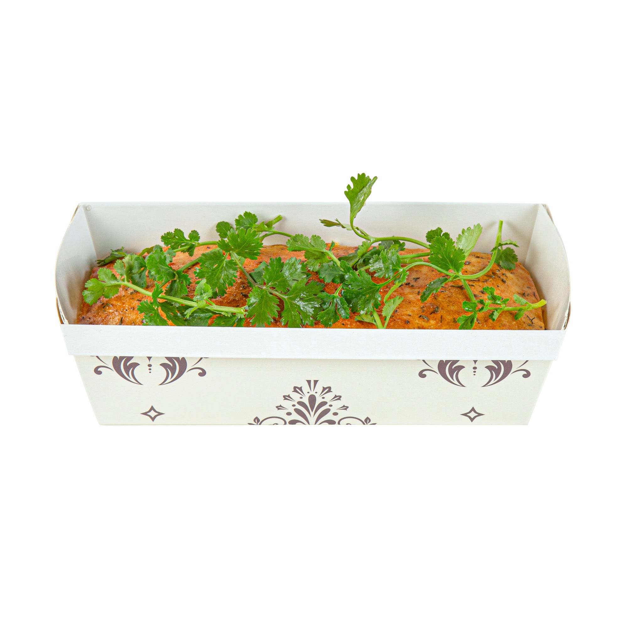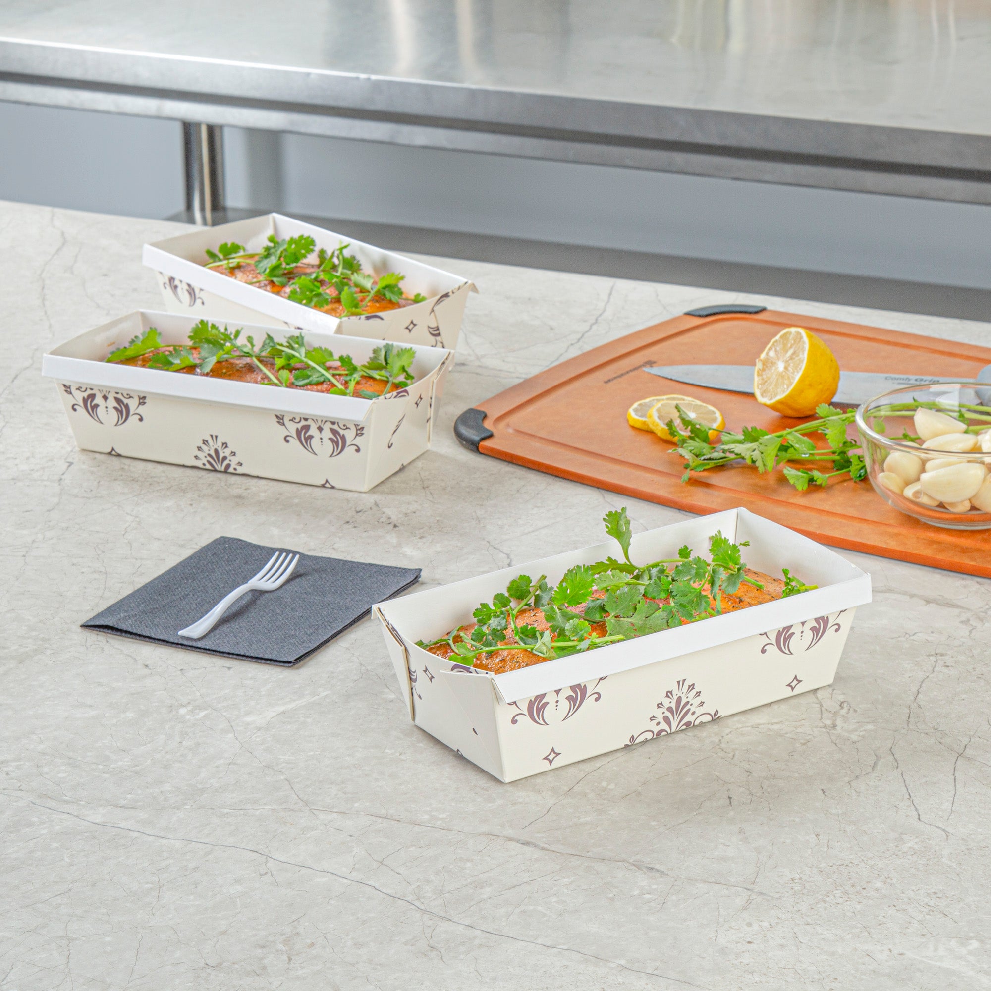 Enhance your baking efficiency with elegant presentation. The Bake Tek Vintage Floral Paper Loaf Pan combines a greaseproof material with a stunning vintage floral design, ensuring your baked goods release effortlessly while adding a touch of sophistication. Oven safe up to 390F, this paper loaf pan allows you to bake directly within its 8-inch length, streamlining your kitchen operations by eliminating the need for additional bakeware. Its greaseproof quality also prevents stains on your baked goods, maintaining their pristine appearance and reducing waste. Ideal for quick bread baking pan needs, this disposable baking pan is also freezer and microwave safe, offering unparalleled versatility in both preparation and storage. Simplify your cleanup process with this disposable solution, saving valuable time and labor costs in bustling foodservice environments. Each order includes 100 Bake Tek Vintage Floral Paper Loaf Pans.