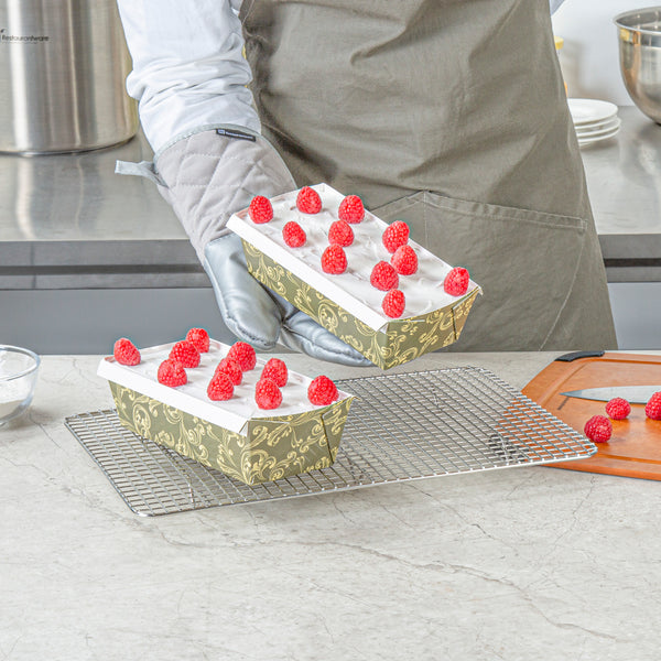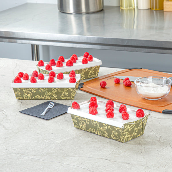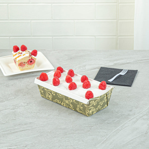 Bake with confidence and ease using the Bake Tek Greaseproof Paper Loaf Pan. This paper loaf pan is crafted from greaseproof paper, ensuring your baked goods release effortlessly, minimizing waste and cleanup time. The oven-safe design withstands temperatures up to 390F, guaranteeing reliable baking results without the need for additional pans. With its attractive vintage floral design, this disposable loaf pan enhances the aesthetics of your bakery display, making it ideal for presenting specialty breads and loaf cakes. Measuring 8 inches in length, it offers a substantial 32-ounce capacity, perfect for bakeries and catering services. Plus, its freezer-safe capability preserves the quality of your creations over time, while the greaseproof lining prevents leaks, keeping displays tidy. Streamline your operations and elevate your presentation with this versatile baking loaf pan. Each order includes 100 Bake Tek Greaseproof Paper Loaf Pan.