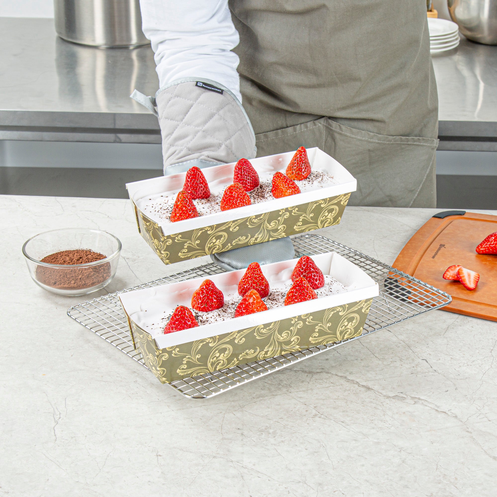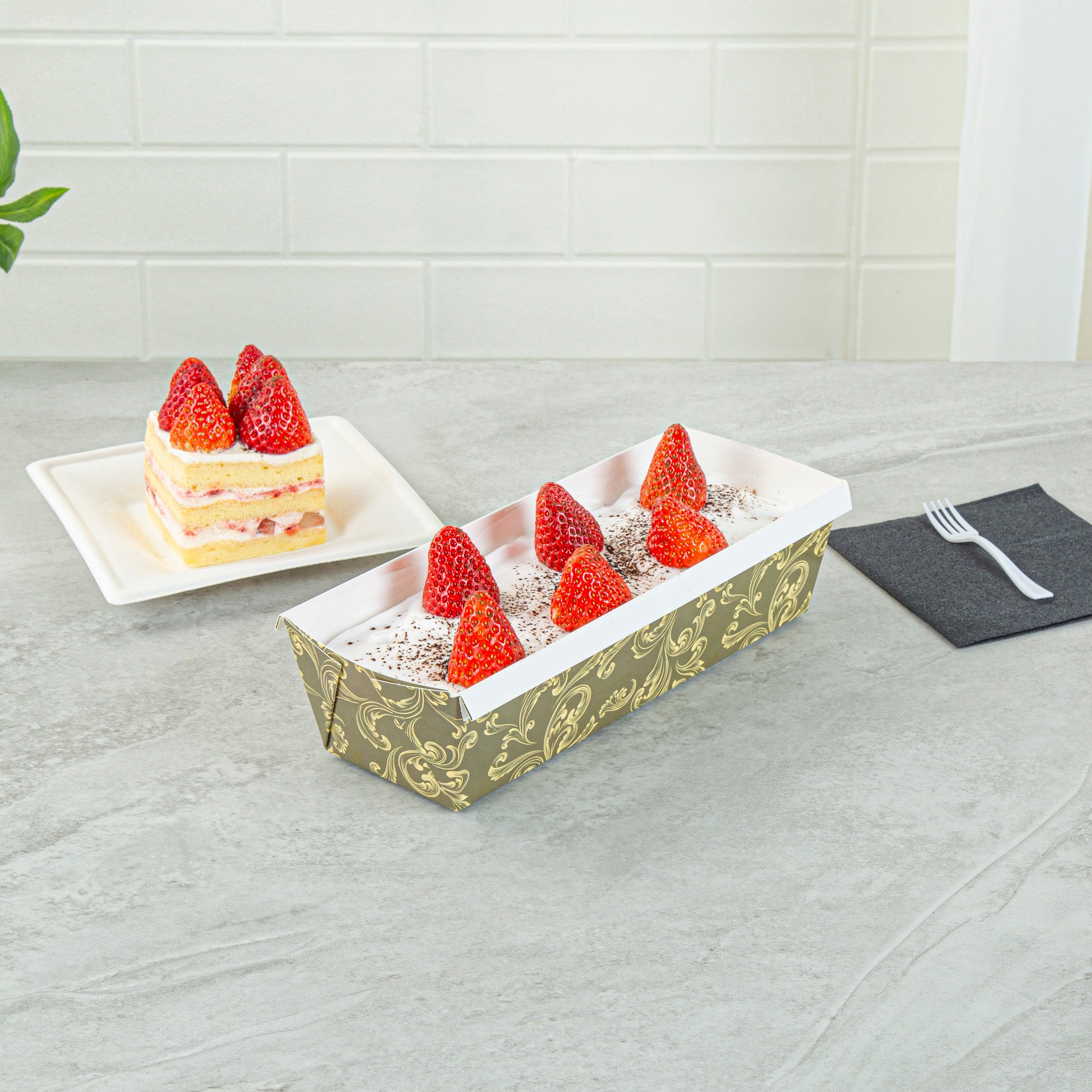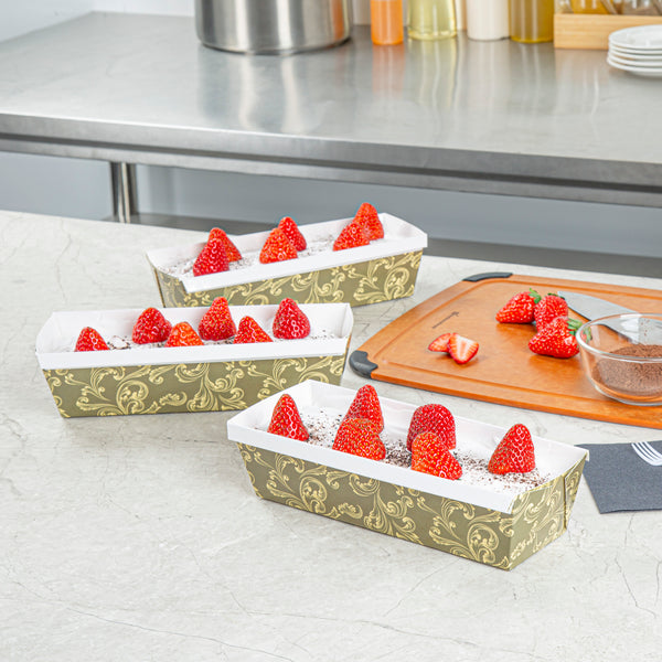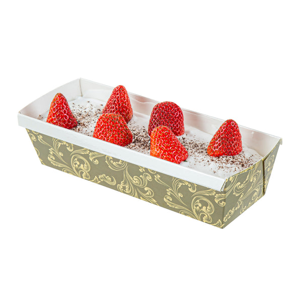 Streamline your bakery operations with versatile disposable loaf pans. The Bake Tek Greaseproof Disposable Loaf Pan combines a durable paper construction with greaseproof material, ensuring baked goods release effortlessly and maintain their shape, reducing food waste. This disposable loaf pan is oven safe up to 390F, preventing warping during baking and making it ideal for quick breads and pound cakes. Featuring a vintage floral design, this greaseproof loaf pan enhances the visual appeal of your bakery display, captivating customers with its elegant touch. With dimensions of 10 inches in length, 3.6 inches in width, and 2.5 inches in height, it offers a 42-ounce capacity, perfect for accommodating substantial portions. Its freezer and microwave-safe capabilities add versatility to your food preparation processes, allowing seamless transitions from storage to serving. Each order includes 100 Bake Tek Greaseproof Disposable Loaf Pans.