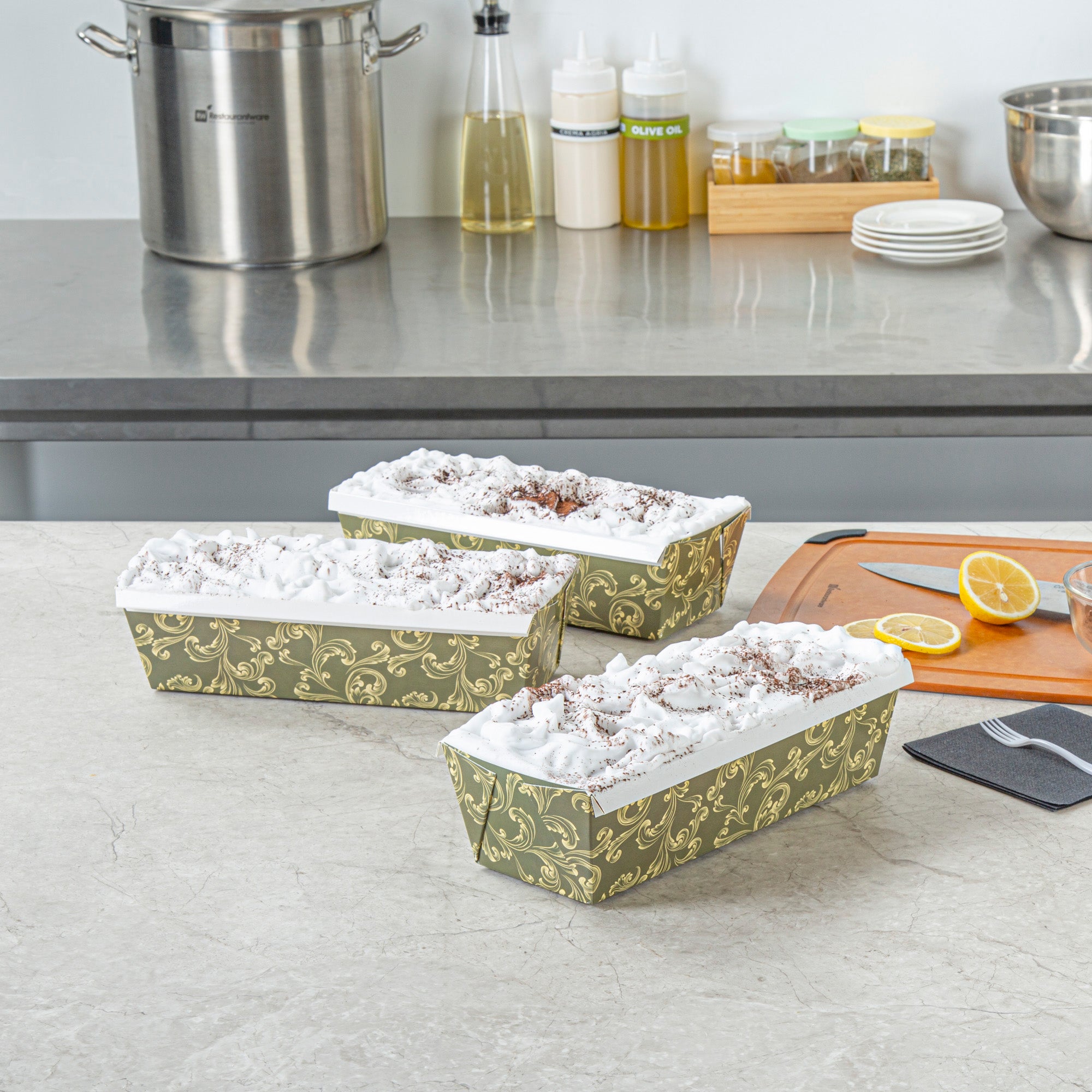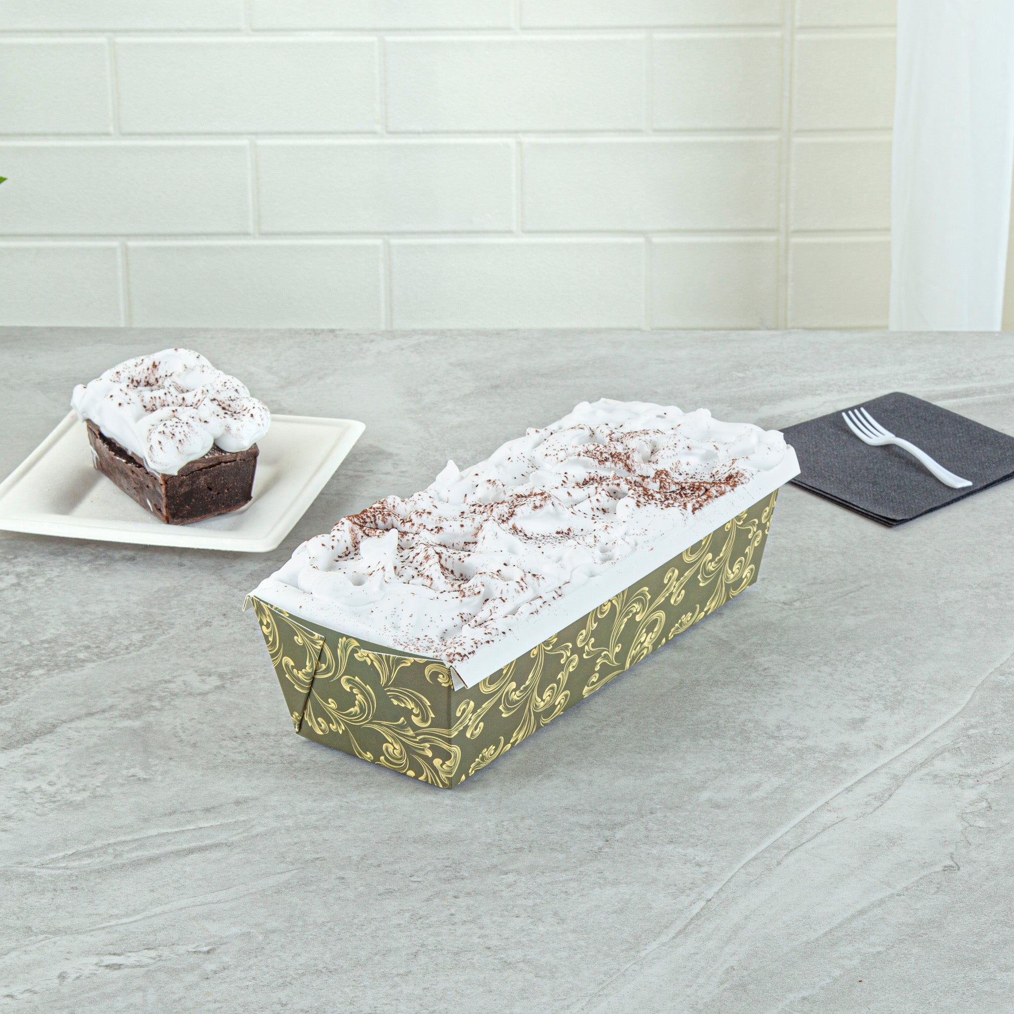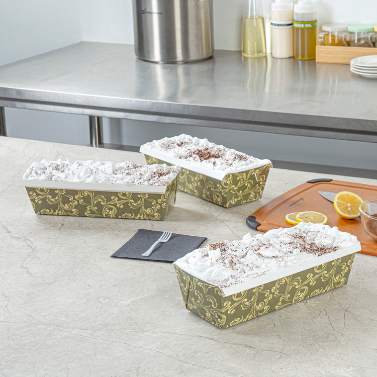 Enhance your bakery's efficiency with versatile bakeware. The Bake Tek Greaseproof Paper Loaf Pan offers an oven-safe design that withstands temperatures up to 390F, ensuring no warping occurs during baking. This paper loaf pan features a greaseproof lining, allowing for easy and clean removal of baked goods, significantly reducing waste and maintaining product integrity. Its vintage floral design not only adds an elegant touch to your presentation but also attracts customers, making it perfect for bakeries and cafes wanting to elevate their display. With dimensions of 10.2 inches in length, 4 inches in width, and 2.7 inches in height, this disposable bread pan is ideal for quick breads and pound cakes, streamlining kitchen operations and minimizing cleanup time. Suitable for oven, freezer, and microwave use, it meets diverse foodservice needs. Each order includes 100 Bake Tek Greaseproof Paper Loaf Pans.