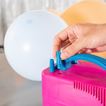 Cover the inflation port with balloons and press down the nozzle to inflate the balloons manually. Operate this pump automatically using the on-off switch to inflate several balloons continuously.