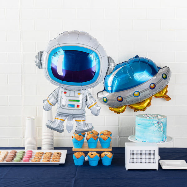 Make your space-themed parties out of this world with our Balloonify Mylar Astronaut Balloons. These astronaut foil balloons are crafted from durable mylar that ensures they maintain their unique shape throughout your event. Featuring a self-sealing valve, these mylar spaceman balloons can be filled with either air or helium by use of a pump. Ideal for all occasions, these moistureproof space party balloons transform any gathering into a cosmic adventure. Reusable, these space-themed birthday balloons are not only a fun decoration but also a memorable choice for your celebrations. To reuse these balloons, gently deflate, properly store, and carefully reinflate without overfilling. Measuring 30.25 inches in length by 23 inches in width, these space birthday balloons have a striking presence that cannot be ignored. Shipped deflated in a 100 count box. These party balloons can be easily inflated with the included straw, providing you with full control to help avoid the risk of over-inflation. Electric air balloon pump (SKU: RWP1061) sold separately.