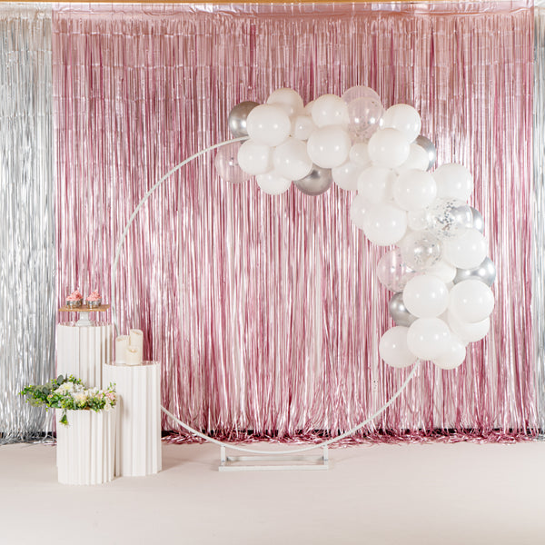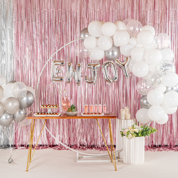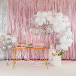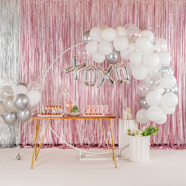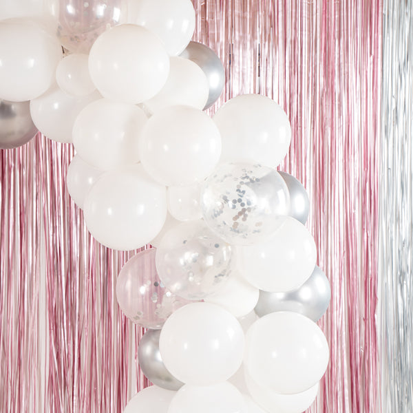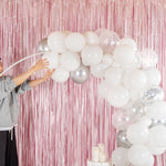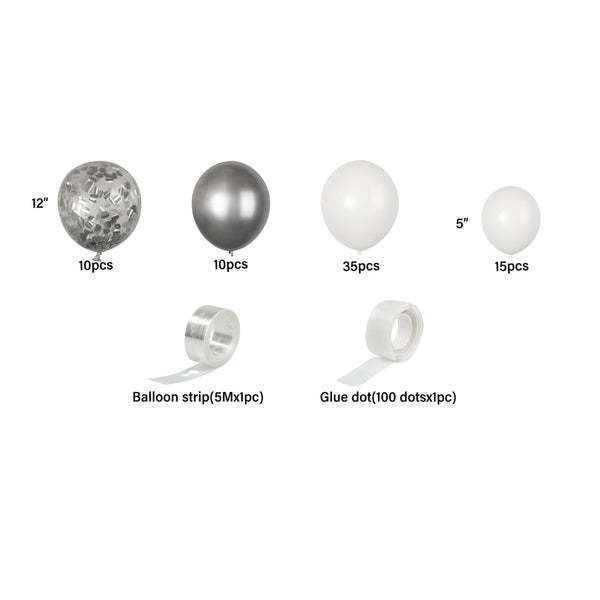 Add colorful decorations to your special occasions with our Balloonify White and Silver Balloon Arch / Garland Kit. The latex balloons of this white and silver arch kit are durable and can be used for both indoor and outdoor events. This balloon arch decoration kit includes 70 balloons, 1 balloon strip, and 1 glue dot strip to set up a garland of your own style. With 50 matte white balloons, 10 metallic silver balloons, and 10 confetti silver balloons, this balloon garland arch kit allows you to create a unique palette of balloons. This balloon arch decoration has confetti balloons to add a shimmering look to your decor. The balloon strip of this balloon garland backdrop set has snowman holes that allow you to insert knotted balloons into the bigger hole and slide it into the smaller one to secure them. Equally gapped, the 16.4-foot balloon chain of this balloon garland arch can effortlessly hold 99 balloons without falling off. The glue dot strip of this balloon garland set has 100 nano glue dot adhesives to attach clusters of balloons to your garland. Plus, they can be conveniently used outdoors as the glue dots are moistureproof. You will receive 12-inch balloons (55 pieces), 5-inch balloons (15 pieces) 16.4-foot long balloon strip (1 piece), and 1 glue dot strip with 100 dots. All the balloons are shipped flat and deflated. Sold in a box with 50 matte white balloons, 10 metallic silver balloons, 10 confetti silver balloons, 1 balloon strip, and 1 glue dot. Arch not included. Electric air balloon pump (SKU: RWP1061) is available and sold separately.