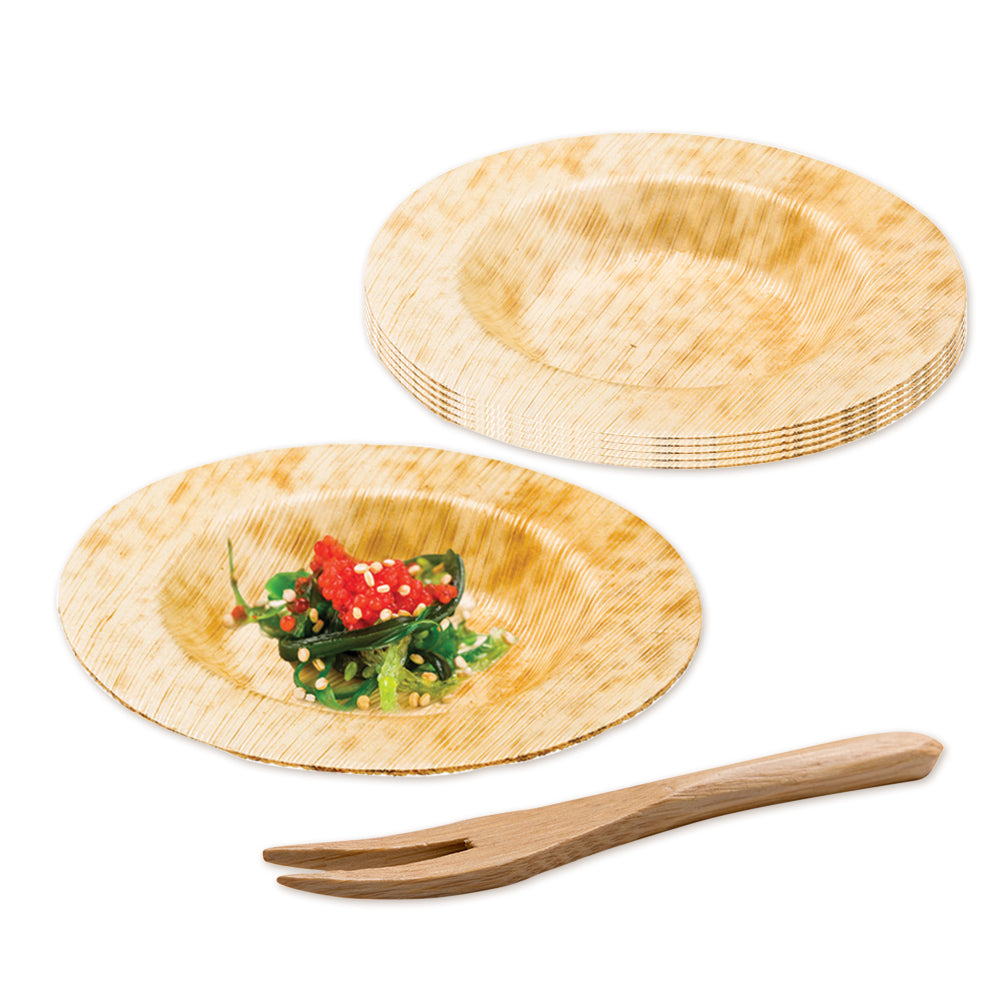 100 ROUND NATURAL 3.5" BAMBOO SMALL PLATES AND 100 MINI FORKS