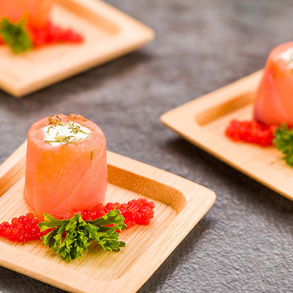 Serve appetizers with our Bambuddha Square Natural Bamboo Carved Plates with Natural Bamboo Mini Forks. Made from premium bamboo, these appetizer plates and cocktail forks do not break or cause splinters, making them perfect for serving hot or cold food items. The simple yet stylish wood finish of these square plates and bamboo forks provides an attractive presentation that pairs well with any decor theme. With a sturdy yet lightweight construction, these bamboo plates are ideal for displaying and serving single bite-sized portions of meats, cheeses, fruits, and other delectable fare. The natural bamboo material of these amuse-bouche plates and single-use tasting forks makes them commercially compostable and biodegradable. Disposable, this bamboo plate and fork bundle set simplifies after-service cleanup and is ideal for catering events, restaurants, and bars. These serving mini plates measure 2.5 inches long by 2.5 inches wide, and the forks measure 3.5 inches long. Each order includes 100 plates and 100 forks. These items will only degrade outside of the traditional solid waste stream.