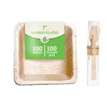 100 SQUARE 7" BAMBOO LEAF SALAD PLATES AND 100 FLATWARE SETS