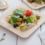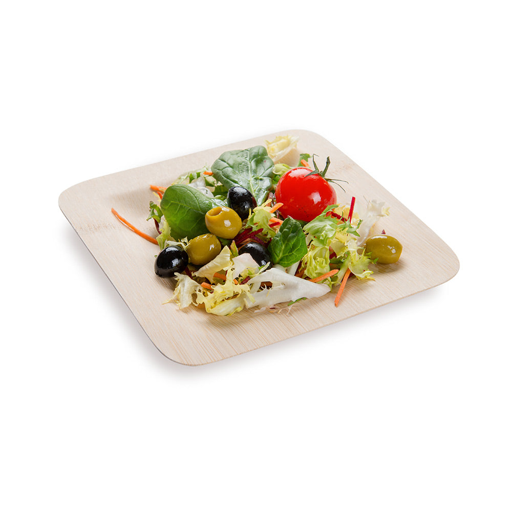 Serve your guests in style with our Bambuddha Square Natural Bamboo Medium Veneer Plates with Natural Bamboo Disposable Flatware Sets. The smooth veneer finish of these biodegradable 7-inch square plates provide an elegant presentation for appetizers, salads, and entrees, while the matching disposable bamboo cutlery sets offer your guests a rustic dining experience. Crafted from sustainable bamboo, these commercially compostable plates and utensils are an ideal choice for any environmentally-conscious foodservice establishment. Pre-rolled and secured with twine, the disposable cutlery sets provide a hassle-free way for staff to set a natural tablescape. Measuring 6.75 inches in length, the knives, forks and spoons in each set are sized for comfort and function. The 16-inch square napkins provide an organic accent to complete your place settings. With a 100-count capacity, these bundled bamboo plates and cutlery sets offer an eco-friendly alternative to traditional disposable dinnerware. Each order includes 100 plates and 100 flatware sets. These items will only degrade outside of the traditional solid waste stream.
