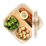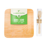 100 SQUARE 9" BAMBOO LARGE VENEER PLATES AND 100 FLATWARE SETS