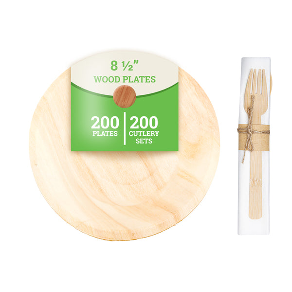 200 ROUND 9" WOOD PLATES AND 200 BAMBOO FLATWARE SETS