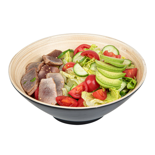 Enhance your presentation with a greaseproof black bamboo bowl. The Bambuddha Black Bamboo Bowl, measuring 8.27 inches in both length and width, boasts a greaseproof design that prevents messes when serving oily dishes, making it ideal for busy foodservice operations. Crafted from premium bamboo, this biodegradable serving bowl is both hot and cold food friendly, allowing chefs to diversify their menu offerings seamlessly. Its freezer-safe construction ensures leftover entrees are preserved effortlessly, enhancing your kitchen's efficiency. As a round bamboo serving bowl, it provides a sustainable solution for eco-conscious establishments, being both biodegradable and commercially compostable. Elevate your dining experience while supporting sustainability with this versatile bowl. Each order includes 1 Bambuddha Black Bamboo Bowl.