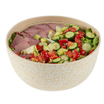 Minimize mess and maximize service with greaseproof design. The Bambuddha Greaseproof Bamboo Salad Bowl is crafted from natural bamboo, offering a greaseproof surface that effortlessly contains oily and saucy dishes without spills. This bamboo salad bowl's freezer-safe convenience allows easy storage of leftovers, making it ideal for large-scale foodservice environments that require efficient and flexible storage solutions. With a spacious 30-ounce capacity and dimensions of 11.02 inches by 11.02 inches by 5.51 inches, it accommodates both hot and cold foods, enhancing menu versatility with its hot food-friendly feature. The biodegradable and commercially compostable bamboo material ensures an eco-friendly choice for environmentally conscious establishments. Elevate your presentation with this bamboo serving bowl, seamlessly integrating sustainability and style. Sold in a 1 count box.