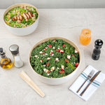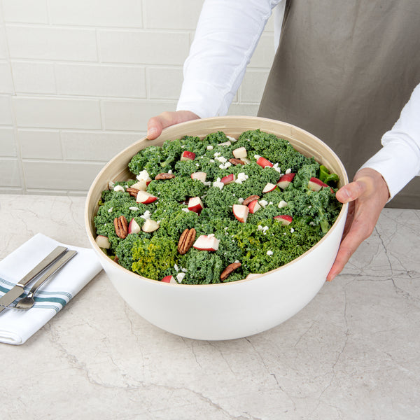 Say goodbye to messy presentations with greaseproof serving ware. The Bambuddha Greaseproof Bamboo Salad Bowl ensures a clean experience when serving oily or saucy dishes, making it an essential bamboo salad bowl for your foodservice establishment. Its biodegradable and commercially compostable bamboo construction provides an eco-friendly option that maintains its integrity with both hot and cold foods, enhancing its versatility as a 13-inch bamboo bowl for any type of cuisine. For added convenience, this reusable salad bowl is freezer-safe, allowing you to effortlessly store leftovers without transferring them to separate containers. With dimensions of 13.39 inches in length and width, and 6.3 inches in height, this white bowl offers a generous capacity of 50.72 ounces, perfect for accommodating large salads or entrees. Maximize your kitchen's efficiency with this multi-functional bamboo salad bowl. Each order includes 1 Bambuddha Greaseproof Bamboo Salad Bowl.
