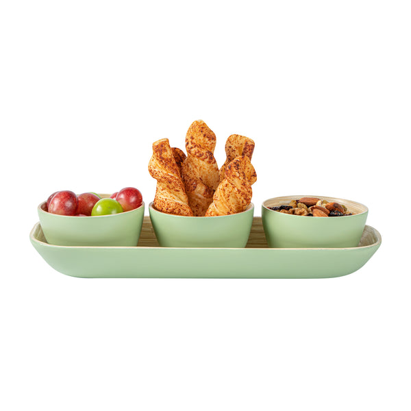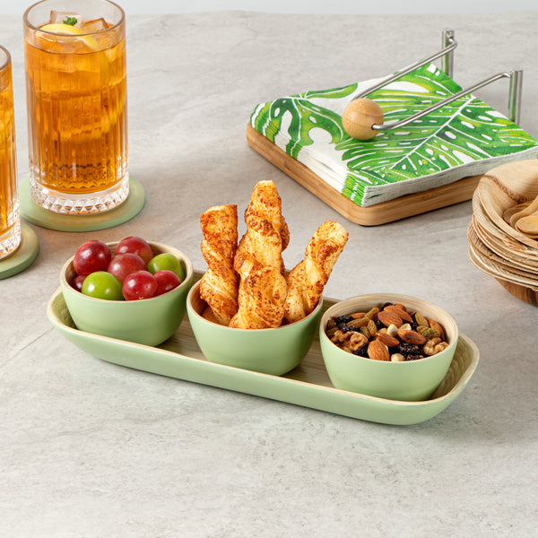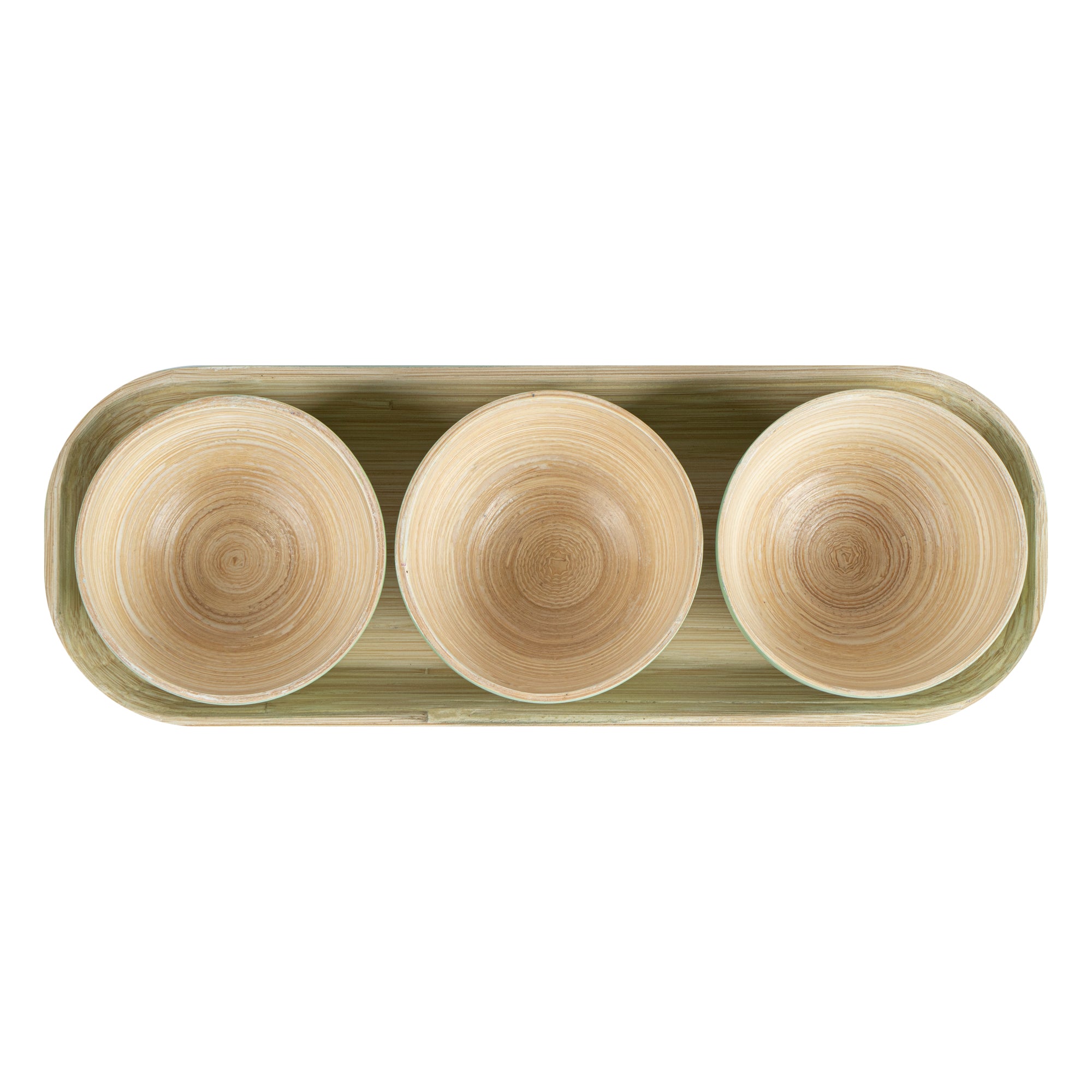 GREEN BAMBOO BOWL SET - 3 BOWLS, BAMBOO TRAY