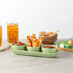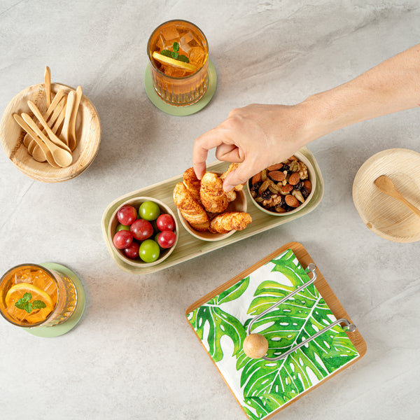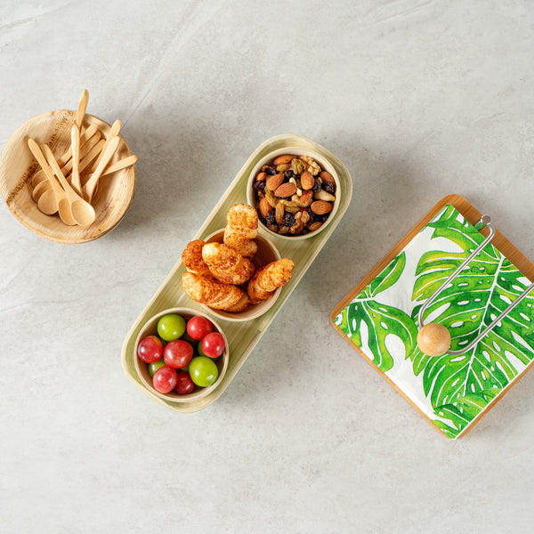 Enhance your tablescape with eco-friendly sophistication. The Bambuddha Bamboo Serving Set combines sustainability with style, making it an ideal bamboo serving set for conscientious dining establishments. Made from sustainable bamboo, this 11.75-inch by 4.25-inch by 1.75-inch set includes a 3-piece bowl set that serves a variety of dishes, providing an organized presentation for appetizers or condiments. Its natural green finish adds a touch of freshness, enhancing the aesthetic of any table setting. The included bamboo tray with bowls offers easy transport, ensuring efficient service during busy events. With a sturdy design that withstands rigorous use without warping, this bamboo appetizer set is suitable for both hot and cold foods, making it a versatile addition to your collection. Choose this set to elevate your presentation while supporting eco-friendly practices. Each order includes 10 Bambuddha Bamboo Serving Sets.