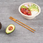 Delicately grab pieces of spicy tuna tataki or scoop up ramen with our Bambuddha Natural Bamboo Chop Fork Duo Utensils. Made from natural bamboo, these chopstick utensils are strong, food-safe, and heat-resistant. The unique connected design of these biodegradable chopstick forks ensures they're comfortable to hold and easy to use with your contemporary Asian fusion fare. These fork chopsticks are disposable for convenient cleaning. With a commercially compostable design, these bamboo fork chopsticks are eco-friendly to use in busy food establishments. Ideal for food trucks, the two-in-one design of these forks with chopsticks makes them a perfect go-to utensil for food trucks, restaurants, or catering companies. Each of these multi-functional chopstick fork utensils measures 10 inches long. Shipped in a 100 count box.