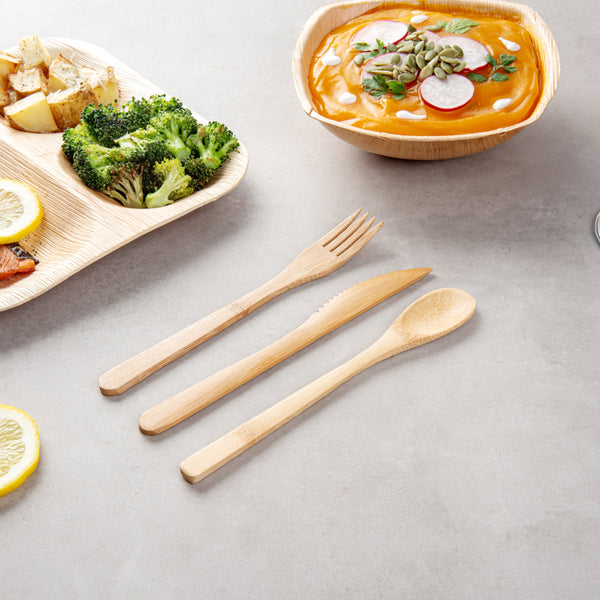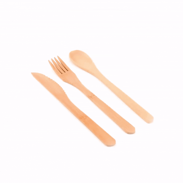 - 3-piece cutlery set includes a bamboo spoon, fork, and knife to pair with any meal