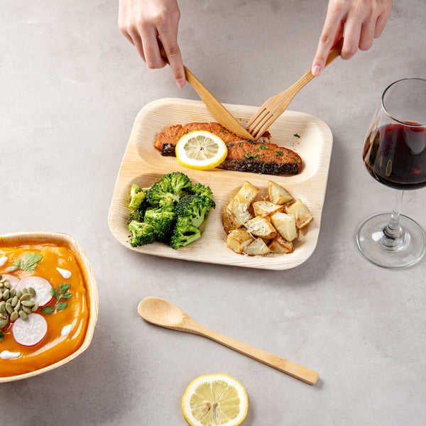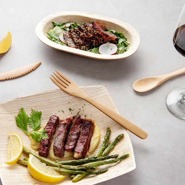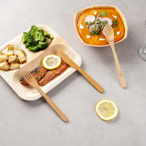 Bring rustic elegance to your tablescapes with our Bambuddha Natural Bamboo Cutlery Set. These disposable wooden cutlery sets are carefully crafted from bamboo that's naturally strong, durable, and stain-resistant. Featuring bamboo construction, these disposable cutlery sets can be used safely with hot or cold foods. The rustic finish of this wooden disposable cutlery beautifully complements any table decor. Wrapped in plastic, these wooden disposable cutlery sets are protected from contamination. These bamboo cutlery sets are commercially compostable, helping you reduce your carbon footprint. With a premium build, these biodegradable bamboo dining cutlery sets do not break or cause splinters. The wood grain finish of this cutlery kit makes any take out order look elegant. Measuring 8 inches long, these bamboo utensils make dinner service seamless. Each disposable bamboo cutlery set includes a spoon, knife, and fork. Sold in a 100 count box.