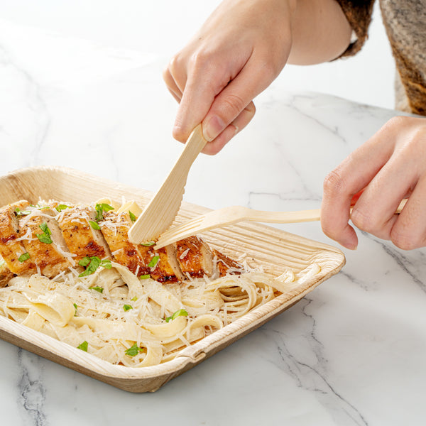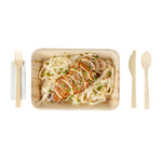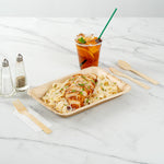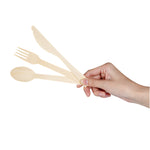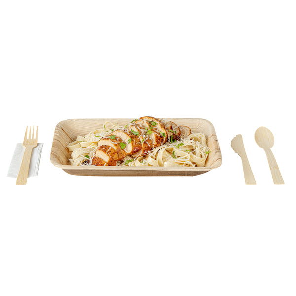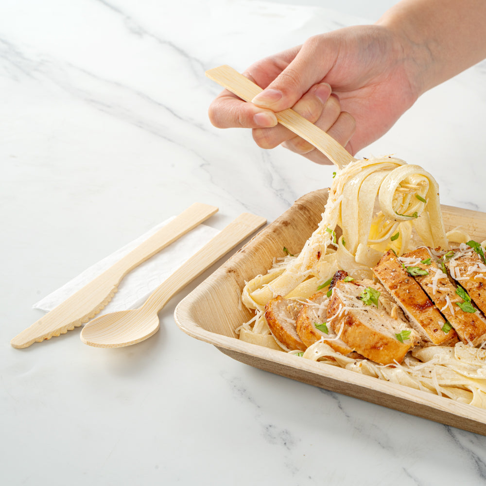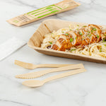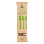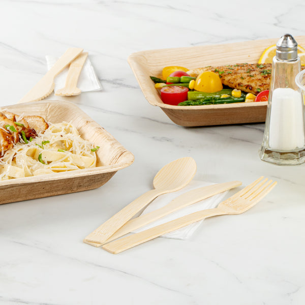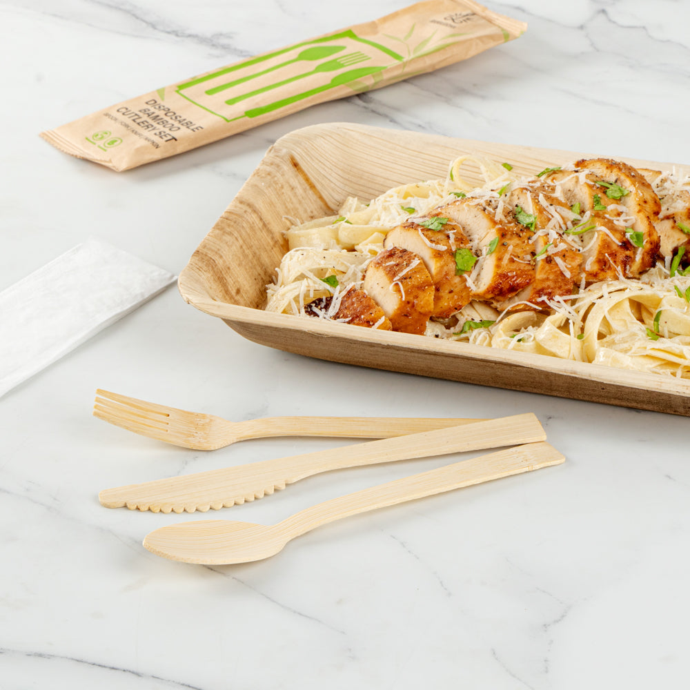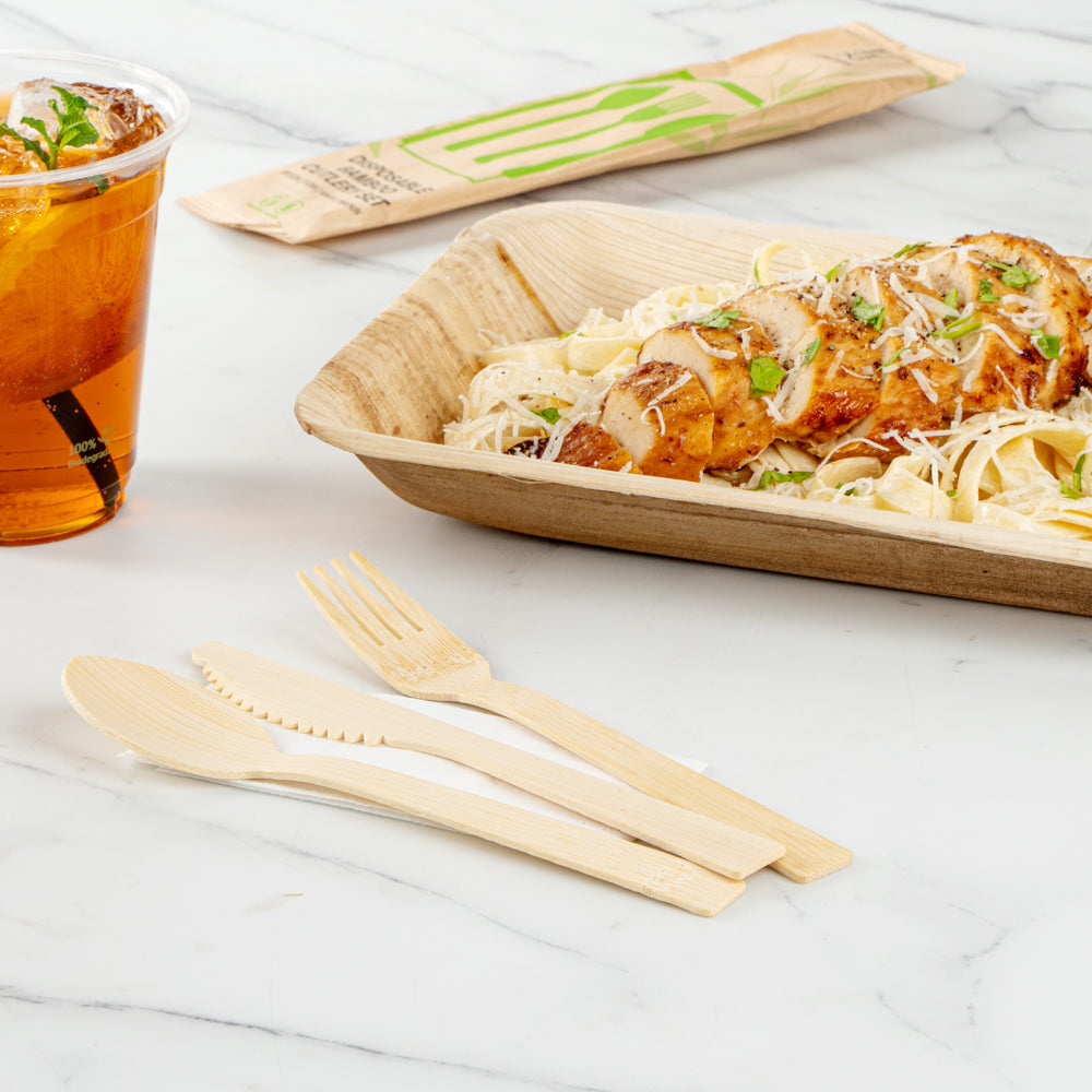 Give your place settings a new look with our Bambuddha Natural Bamboo Disposable Cutlery Sets. To effortlessly enjoy multiple dishes, these disposable utensil sets include a fork, spoon, knife, and white napkin conveniently packaged in kraft paper pouches to ensure cutlery stays clean. Crafted from sustainable bamboo, these travel cutlery sets are commercially compostable and biodegradable to minimize waste on the planet. The heat-resistant design of these bamboo utensils ensure that they won't warp due to the temperatures of hot meals. Featuring a smooth surface, these bamboo flatware sets help you avoid getting splinter while handling them. With a wood grain finish, these disposable bamboo utensils complement your theme or event's aesthetic. These disposable cutlery sets have a fork, spoon, and knife that measure 7 inches long. Sold in a 500 count box. This item will only degrade outside of the traditional solid waste stream.