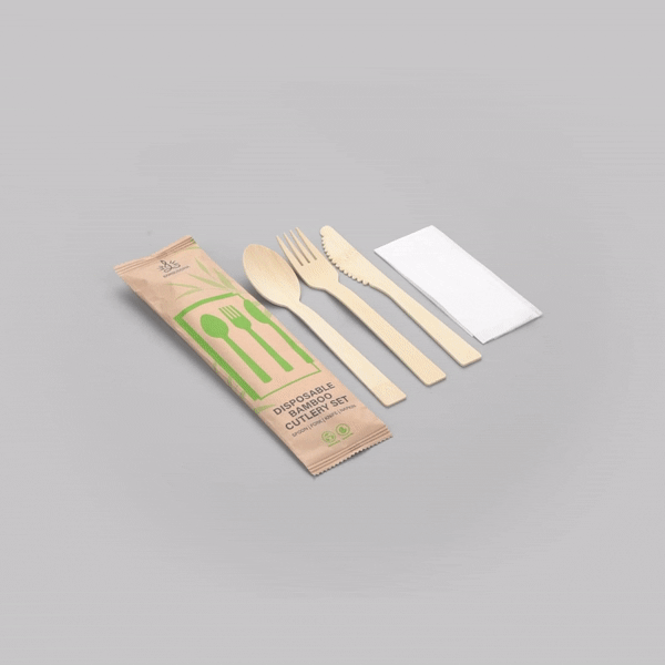 NATURAL BAMBOO DISPOSABLE CUTLERY SET - WHITE NAPKIN, KRAFT POUCH