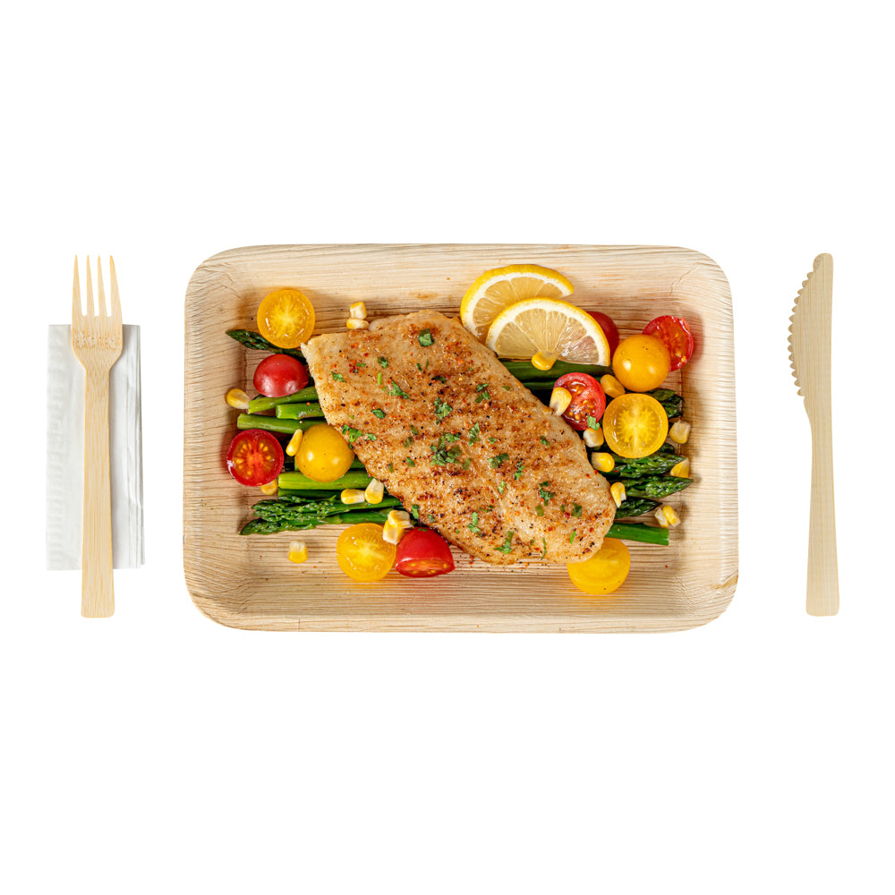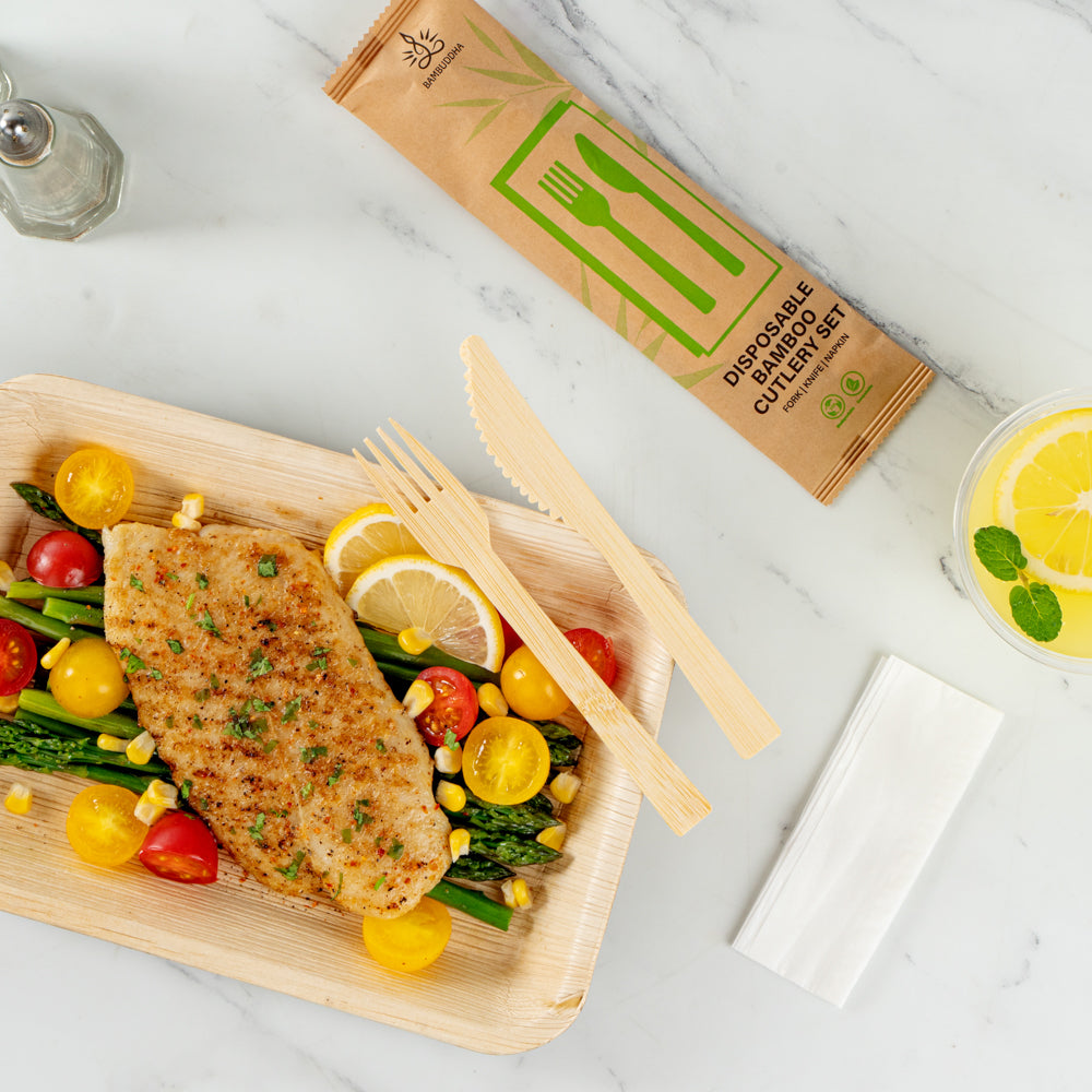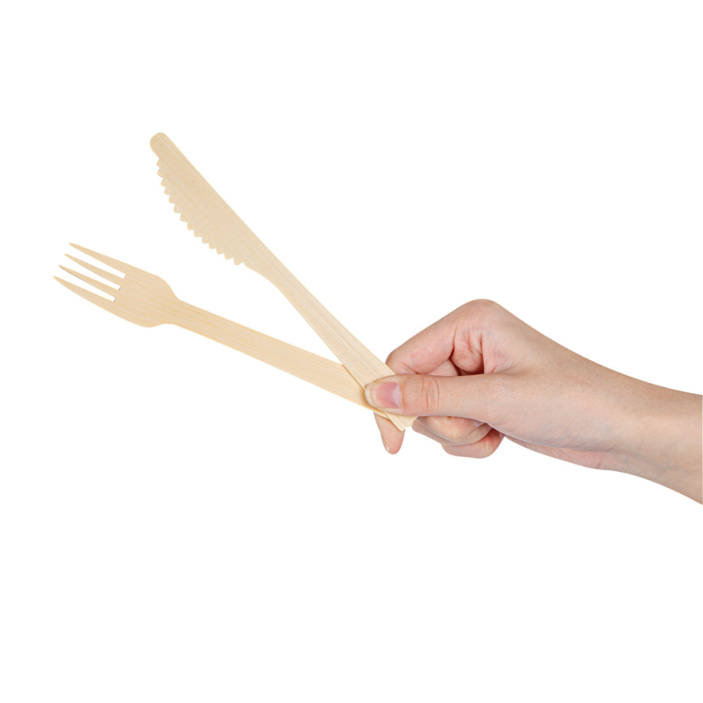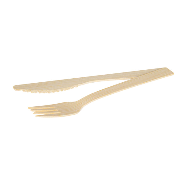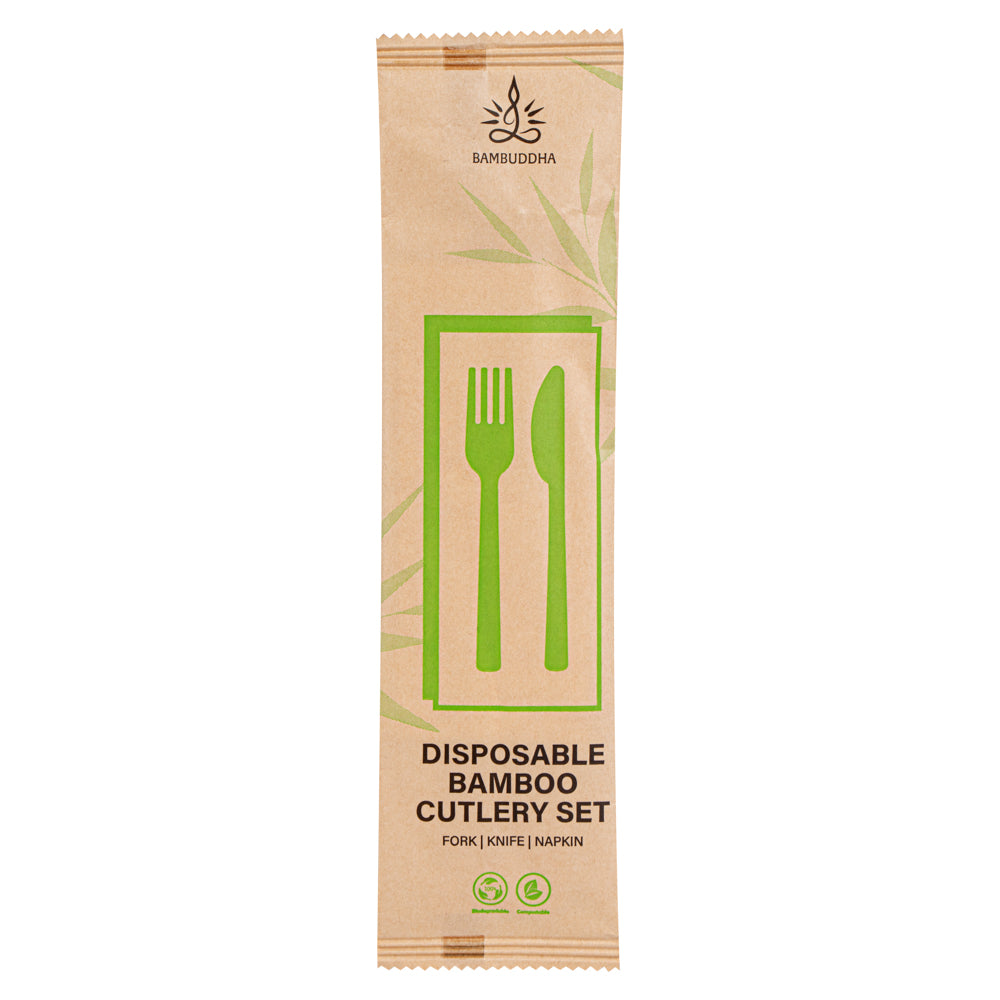Create an eco-friendly dining experience with our Bambuddha Natural Bamboo Disposable Fork / Knife Set. These flatware sets consist of a fork, knife, and white napkin, inside a paper pouch to ensure your utensils stay without any unwanted substances. Made from sustainable bamboo, these disposable wooden cutlery sets are commercially compostable and biodegradable to reduce your carbon footprint. To ensure the fork and knife don't warp while enjoying meals, these bamboo cutlery sets are heat-resistant. With a smooth finish, these travel cutlery sets make it easy to avoid splinters on fingers. For elevating your dining experience, these disposable utensils have a pleasing wood-grain finish. These bamboo utensils have a fork and knife that measure 7 inches long. Sold in a 100 count box. This item will only degrade outside of the traditional solid waste stream.