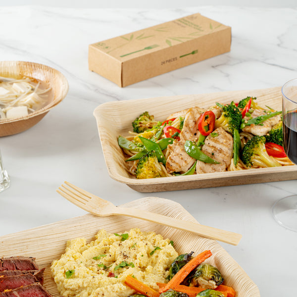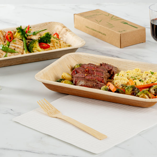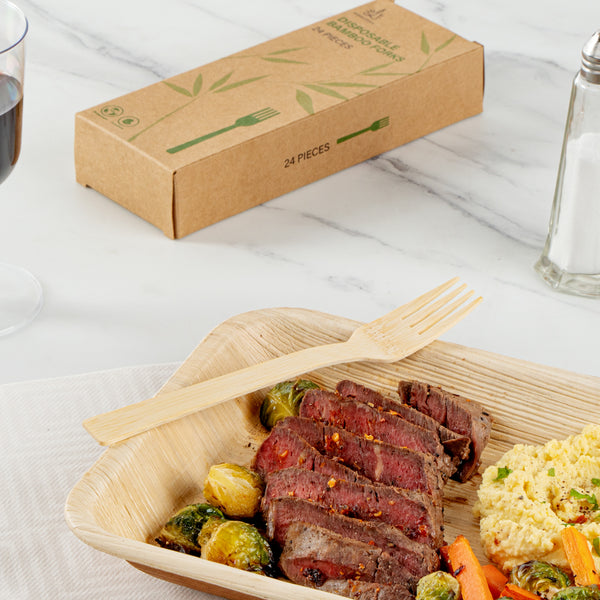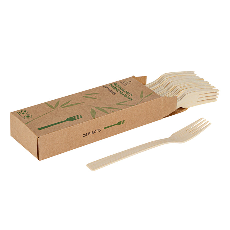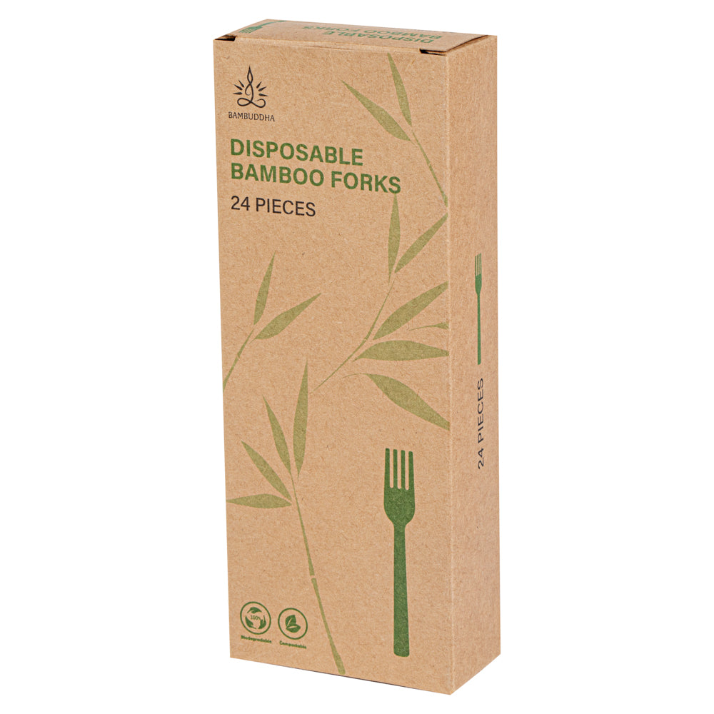 Time to throw out your plastic forks and replace them with our Bambuddha Natural Bamboo Disposable Forks. These forks are made from sustainable bamboo to offer an eco-friendly option to traditional flatware. You also won't have to worry about contaminating the planet when disposing of these bamboo forks since they are commercially compostable and biodegradable. Designed with a durable material, these heavy-duty forks withstand hot temperatures to conveniently enjoy all types of meals. Designed with a smooth feel, these commercially compostable forks are splinter-free for safe handling. Great for outdoor events, these bamboo utensils have a rustic wood grain natural finish. These bamboo forks measure 7 inches in length. Sold in a 24 count box. This item will only degrade outside of the traditional solid waste stream.