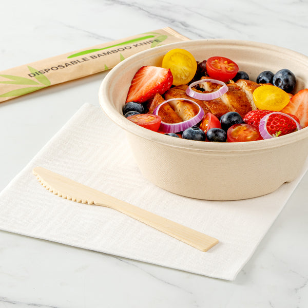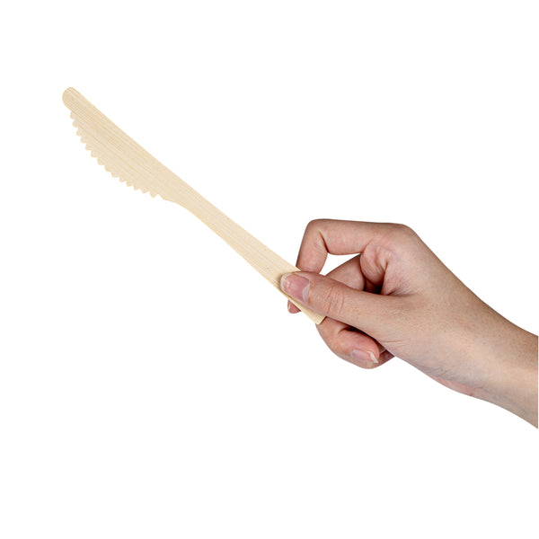 Enhance your food presentations with our Bambuddha Natural Bamboo Disposable Knives. Made from sustainable bamboo, these heavy-duty knives are a great addition to your establishment. Plus, they are biodegradable and commercially compostable without harming the planet. These bamboo knives are highly durable to endure warm temperatures, allowing you to eat a variety of foods. To consume meals easily, these disposable knives do not contain splinters and have a smooth finish. Individually wrapped in a kraft paper pouch, these bamboo utensils make transport easy and maintain them clean at all times. These bamboo knives have a wood grain finish to suit outdoor-themed events. These biodegradable knives measure 7 inches in length, perfect for restaurants, office break rooms, or fast food stands. Sold in a 100 count box. This item will only degrade outside of the traditional solid waste stream.
