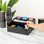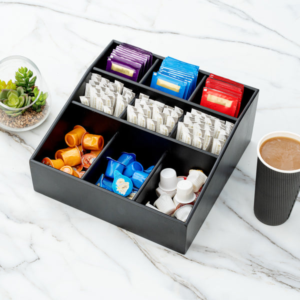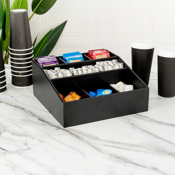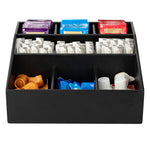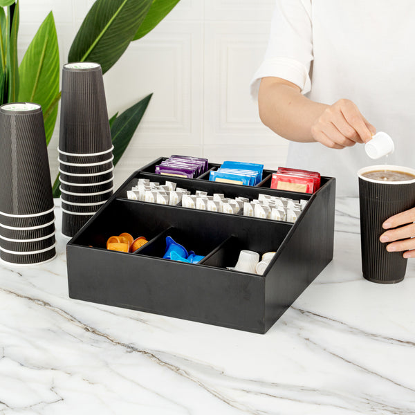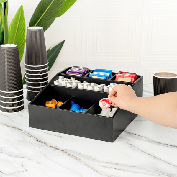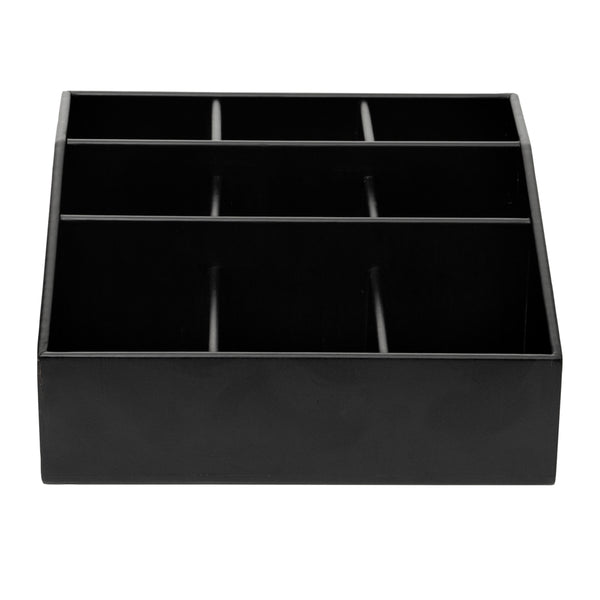 Easily organize a variety of condiments with our Bambuddha Square Black Bamboo Condiment Organizer. With 9 total compartments, this elegant condiment caddy gives you the ability to store sugar packets, creamers, and stirrers at your cafe or sauce packets, flatware, and napkins at your fast-casual restaurant. Created from all-natural bamboo, this coffee condiment organizer is nature-friendly and chip-resistant to maintain its premium design for long-lasting use. This chic packet holder has a smooth black finish that brings a charming touch to your foodservice establishment. With a total measurement of 11.75 inches long by 11.75 inches wide, this stylish condiment holder allows you to put all the condiments you have to offer at your self-service station in one location. Each of the 3 top compartments measures 2.75 inches long by 2.6 inches wide. The 3 middle compartments measure 3.4 inches long by 2.6 inches wide and the bottom compartments measure 4.75 inches long by 3.5 inches wide. Shipped in a 1 count box.