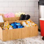 Our Bambuddha Square Natural Bamboo Condiment Organizer ensures that condiments in your beverage stations are clean and tidy. Crafted from all-natural bamboo, this nature-friendly condiment holder is chip-resistant, durable, and built to last. With a natural bamboo finish, this chic condiment organizer adds a natural look to your cafe, catered event, or breakfast buffet. With 9 total compartments, this eco-friendly packet organizer allows you to place all your condiments in one area. Measuring 11.75 inches long by 11.75 inches wide, this versatile condiment organizer gives you the ability to store sugar packets and creamers at your coffee shop or flatware and sauces at your fast-casual restaurant. The 3 bottom compartments measure 4.75 inches long by 3.5 inches wide. Each of the 3 middle compartments measures 3.4 inches long by 2.6 inches and the top compartments measure 2.75 inches long by 2.6 inches wide. Available in a 1 count box.