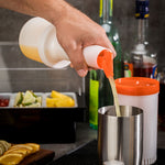 Simply add a dash of juice to drinks and store it for later in our Bar Lux Quick Pour Storage Container Bottle with Orange Spout and Lid. This versatile storage container features 2 interchangeable lids, the spout lid for quick and easy dispensing of fresh juices and the storage lid that doubles as the base of the container for convenient storage. Crafted from plastic, this durable orange juice bottle has a long neck providing an easy grip for bartenders to efficiently add syrups and juices to signature cocktails. This handy juice pourer is ideal for storing and pouring mixers behind the bar or for containing cooking oil and sauces in your restaurant's kitchen. Plus, they have vibrant orange lids allowing for easy identification for your establishment's color-coded system. Containing up to 0.5 quarts, this plastic pour bottle measures 3.5 inches long by 10.2 inches tall and ships in a 1 count box.