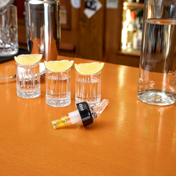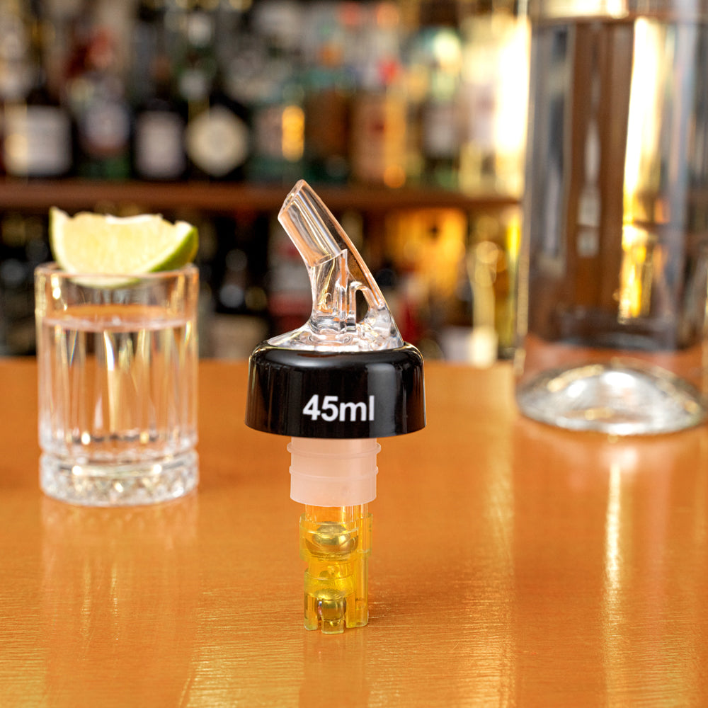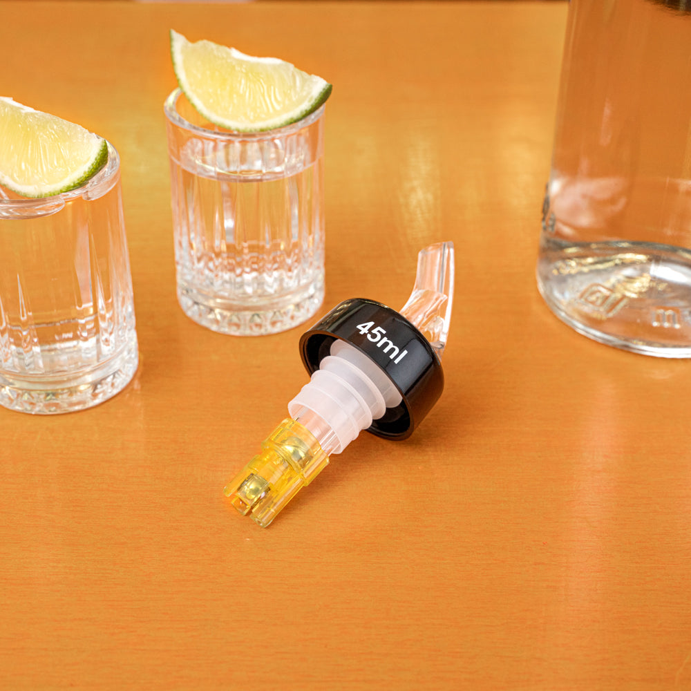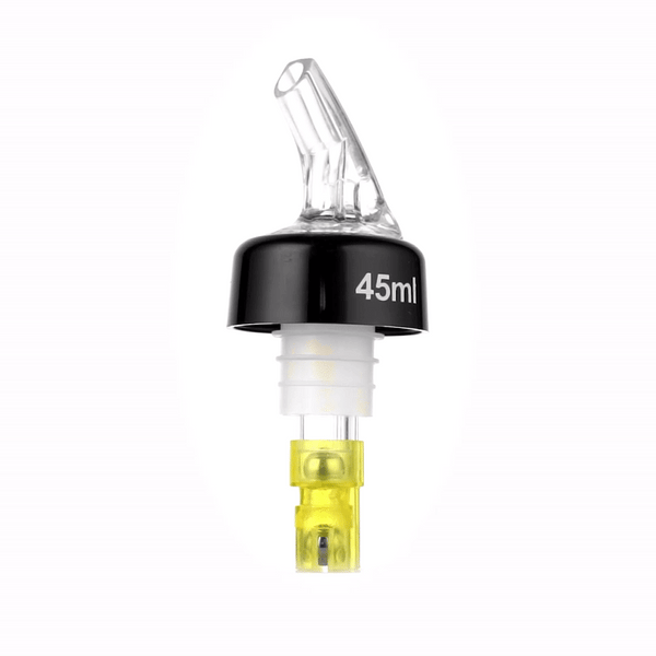 Pour spirits using our Bar Lux 1.5-ounce Yellow Plastic Measured Liquor Pourers. These drink pourers have a clear spout and tight-fitting black collar that keeps liquors from spilling out while serving guests. Ideal for accurately measuring beverages while serving, these liquor pourers are made with ball bearings that allow you to smoothly pour spirits without creating messes. These liquor spouts are designed with a yellow tail so employees can quickly identify and differentiate alcohols or spout sizes. Made from premium plastic, these liquor pourers are crack-resistant to maintain their stylish look during frequent use at your bar. Intended for use with spirits with an ABV of 40% or more, these liquor spouts allow you to pour up to 1.5 ounces of spirits at a time. When used with liqueurs, syrups, or juices, the measurements may not be accurate. To ensure smooth pouring, these spirit pourers should be shaken before use and poured at an angle greater than 45 degrees. Designed to fit standard-sized liquor bottles, these drink pourers measure 1.38 inches in diameter by 3.74 inches in height. Shipped in a 10 count box.