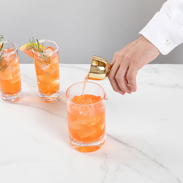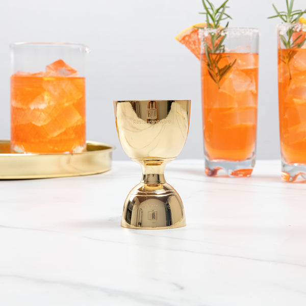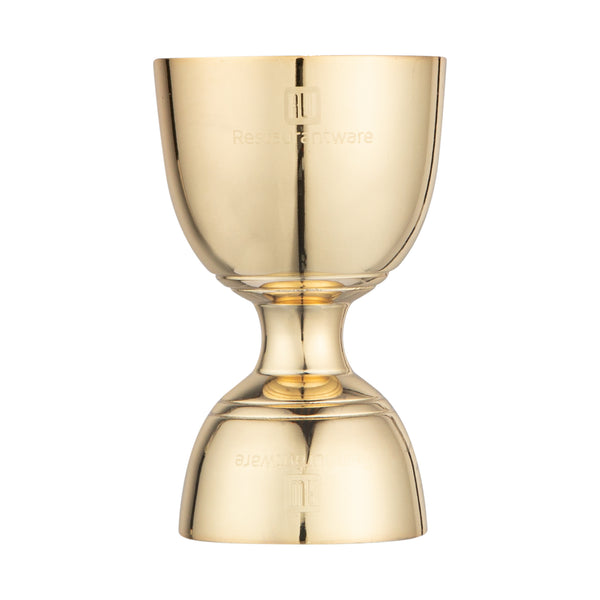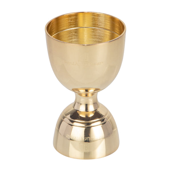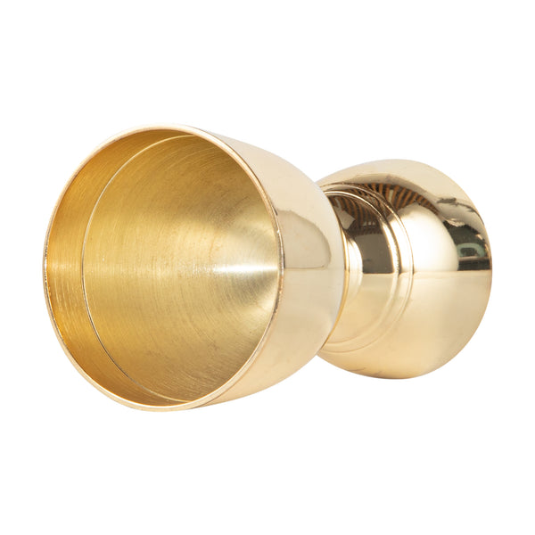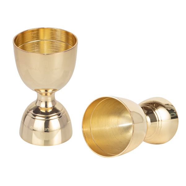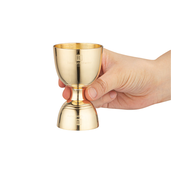 Boost consistency in your cocktail recipes with this Bar Lux Gold-Plated Stainless Steel Jigger. Featuring a double-sided design, this premium cocktail jigger makes it easy for bartenders to transition between measuring 2-ounce and 1-ounce pours of liquors, juices, syrups, and other cocktail mixers. The bell shape provides a secure and comfortable way to grasp the jigger while preparing cocktails, while the straight edges ensure easy and drip-free pouring. Manufactured from high-quality stainless steel, this double-sided jigger is built to withstand daily use in busy bars and restaurants without rusting or corroding. This two-sided jigger is ideal for increasing precision to ensure bartenders are able to successfully create well-balanced cocktails without overpouring. We recommend handwashing to preserve the jigger's high-shine, gold-plated finish. This stainless steel bell jigger is sold in a 1 count box.