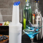 Keep the back of your bar organized with our Bar Lux Quick Pour Storage Container Bottle with Blue Spout and Lid. Sold with 2 interchangeable lids, use the spout lid to quickly pour juices and syrups into signature cocktails and at the end of the day, simply screw off the base of the container that doubles as an airtight lid for convenient storage all in one. With a long neck design, this 1-quart simple syrup bottle provides an easy grip for bartenders to efficiently add a splash of juice to hand-crafted cocktails or for chefs to swiftly dispense cooking oil on to large pans. This versatile plastic bottle with lids is a must have tool for your rooftop bar, hotel lounge, restaurant, and more. Measuring 3.5 inches long by 13 inches tall, this simple syrup container is shipped in a 1 count box.