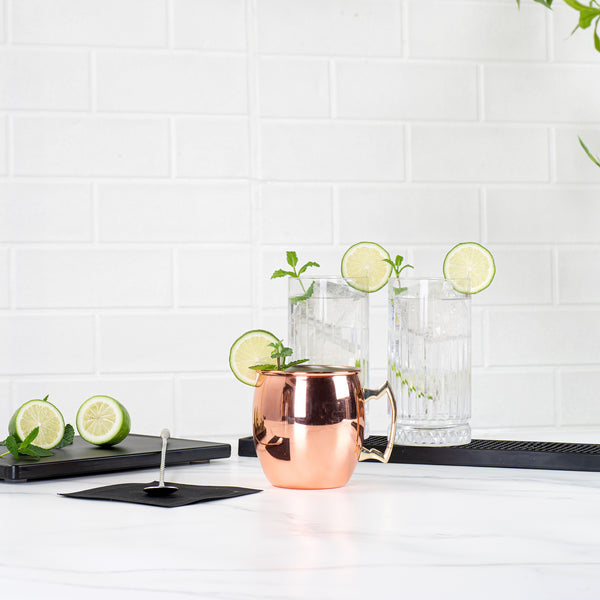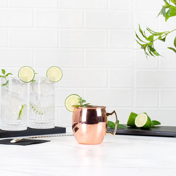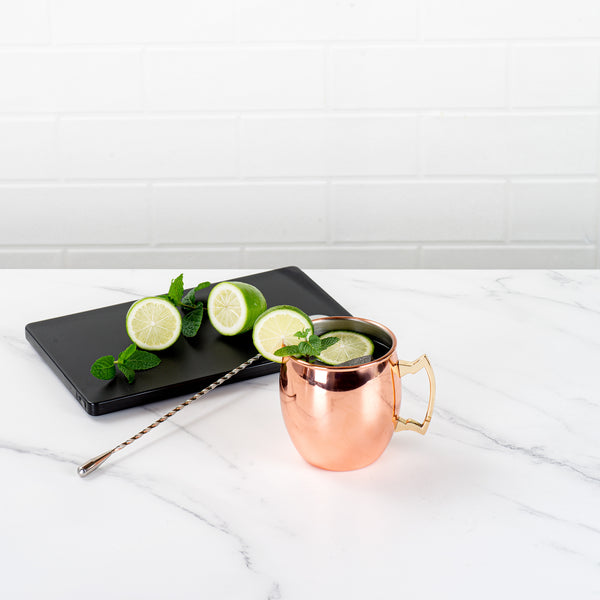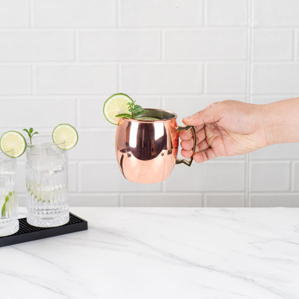 Serve up signature Moscow mules with our Bar Lux 16-ounce Copper-Plated Stainless Steel Moscow Mule Mugs. Featuring modern copper plating, this chic steel mule mug instantly upgrades the look of drinks served at your bar, hotel, restaurant, and more. With a convenient handle, this copper-finish mug can easily be held, while moving around during gatherings. With a food-grade stainless steel construction, this copper mug is conveniently break-resistant and adds a stylish touch to alcoholic and non-alcoholic drinks. Containing up to 16 ounces, use these trendy copper cups to beautifully present classic Moscow mules at your rooftop bar or to fashionably serve tangy margaritas at your restaurant. These 16-ounce mule cups measure 3.5 inches in diameter by 3.75 inches in height. Sold in a 1 count box.