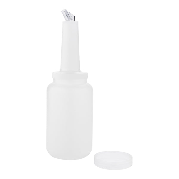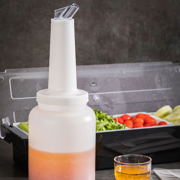 Easily store and pour freshly squeezed juices or flavored syrups with this Bar Lux Quick Pour Storage Container Bottle. Equipped with a twist-on storage lid and an easy-to-use dispensing lid, this 2.5-quart juice pour bottle keeps prepared ingredients organized and easily accessible throughout the shift. The airtight storage lid keeps juices fresh and ready-for-use, while the dispensing lid ensures a smooth flow of liquid for precise and consistent pouring. Also ideal for use as a simple syrup container or simple syrup dispenser, this quick pour bottle is designed with straight walls and a detachable neck for easy and efficient cleaning. Each of these plastic storage bottles is manufactured from plastic and is dishwasher-safe. This 2.5-qt quick pour container is sold in a 1 count box.
