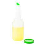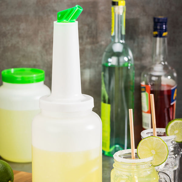 Create an efficient and organized way to store freshly squeezed juices and other prepared ingredients with this Bar Lux Quick Pour Storage Container Bottle. Equipped with a twist-on storage lid and an easy-to-use dispensing lid, this 2.5-qt plastic pour bottle makes it easy for staff to stay organized and prepared during their shift. The dispensing lid features a built-in pour spout to enable smooth and consistent pouring, while the leak-resistant storage lid creates an airtight seal to maximize freshness. Designed with a green, color-coded pour spout and storage lid, this juice storage bottle is perfectly suited for storing lime juice, sour mix, and other cocktail mixes. Each of these containers with spouts has a total capacity of 2.5 quarts and is dishwasher-safe. This 2.5-ounce quick pour storage container bottle is sold in a 1 count box.