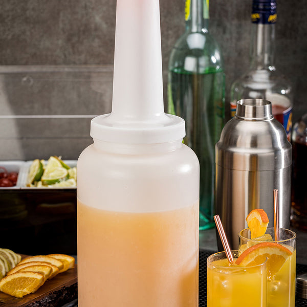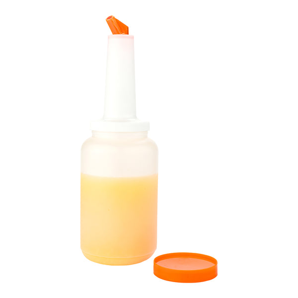 Simplify your bar storage and cocktail preparations with this 2.5-quart Bar Lux Quick Pour Storage Container Bottle. Designed with two easily interchangeable lids, this premium plastic pour bottle allows your staff to seamlessly transition between storing and pouring backup juices, syrups, and sauces. The dispensing lid's built-in pour spout makes it easy to smoothly and precisely pour your prepared ingredients, while the leak-resistant storage lid provides an airtight seal for optimum freshness. Ideal for storing orange juice, flavored syrups, or other sauces, these dressing containers are equipped with orange color-coded details for quick identification and effortless organization. Each of these 2.5-quart juice storage containers is manufactured from plastic and is dishwasher-safe. This 2.5-qt quick pour bottle is sold in a 1 count box.