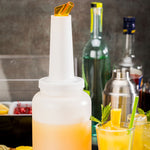 Keep your cocktail mixes and freshly squeezed juices organized and easily accessible with this Bar Lux Quick Pour Storage Container Bottle. Designed with an easy-to-use dispensing lid and an airtight storage lid, this 2.5-quart quick pour bottle is perfect for storing backup containers of ready-to-use ingredients in busy bars and restaurants. The dispensing lid's built-in vented pour spout enables smooth and precise pouring, while the twist-on storage lid provides a leak-resistant and airtight seal for maximum freshness. Each of these quick pour containers with spouts features yellow color-coded details that are ideal for storing lemon juice, lemonade, sour mix, and more! Each of these plastic bottles with pour spouts is dishwasher-safe for quick and easy cleanup. This 2.5-qt plastic storage container bottle is sold in a 1 count box.