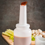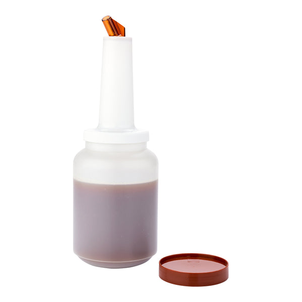 Use this Bar Lux Quick Pour Storage Container Bottle to make it easy to store and pour juices, sauces, syrups, batters, dressings, and more! Equipped with two interchangeable lids, this juice pour bottle is specially designed to help staff stay more organized and efficient while preparing cocktails and executing recipes. The airtight storage lid keeps your prepared ingredients fresh and ready-for-use, while the dispensing lid ensures a smooth flow of liquid for precise and consistent pouring. Featuring an easy-to-grip neck and built-in pour spout, the dispensing lid is perfect for helping bartenders quickly make drinks and stay prepared behind the bar. Each of these clear plastic bottles for juices and syrups is outfitted with brown color-coded accents to make it simple for staff to stay organized. This 2-quart plastic bottle with built-in pour spout is manufactured from premium plastic and designed to withstand long-term use in busy bars and kitchens. This 2-qt container is sold in a 1 count box.