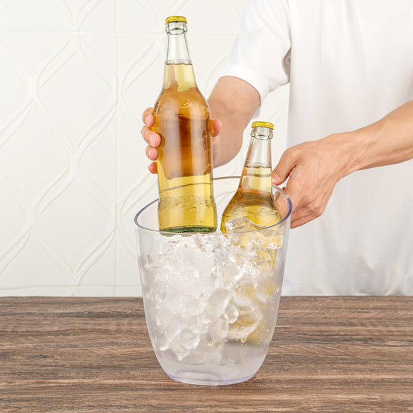 Serve high-end bottles of champagne and wine using our Bar Lux 3.2-quart Round Clear Plastic Champagne / Wine Buckets. With a clear finish, these beverage tubs bring a unique and sleek look to beverage presentations at your restaurant, hotel, or bar. Crafted with premium plastic, these bar buckets are break-resistant to withstand frequent use at your establishment. Great for making drinks portable at catered events, these beverage tubs are equipped with built-in handles. To avoid spills at your restaurant, these bar buckets have a sturdy base that provides stability on all surfaces. Measuring 9.3 inches in length by 7.5 inches in width and 7.8 inches in height, these beverage buckets hold up to 3.2 quarts. Shipped in a 10 count box.