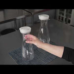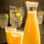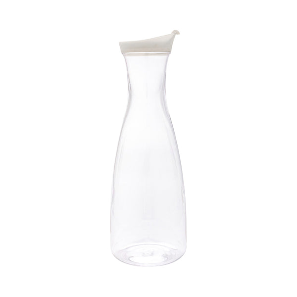 Serve sangrias, mimosas, and other batched cocktails with ease using this Bar Lux 34-Ounce Clear Plastic Carafe. Featuring a high-clarity plastic construction, this carafe has the sophisticated look of a glass carafe without the high price or risk of chipping and cracking. The sleek hourglass shape creates a slip-resistant and comfortable grip for pouring your beverages, while the included lid reduces the possibility of spills or messes when not in use. Equipped with a built-in hinge closure on the lid, this plastic water carafe can easily be transitioned between storage in the fridge and refilling customers' beverages in the dining room. This plastic juice carafe can contain up to 34 fluid ounces and is excellent for showcasing your fresh-squeezed juices, wines, and other popular refreshments. This 34-oz carafe with lid is sold in a 1 count box.