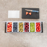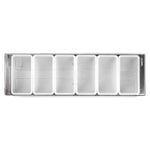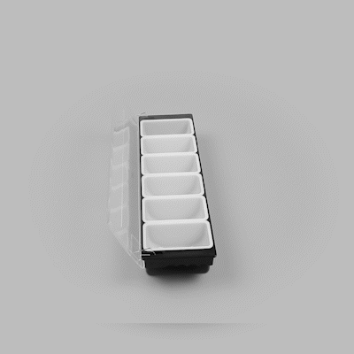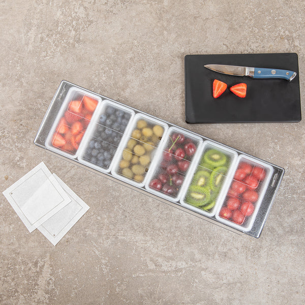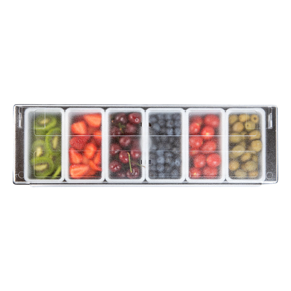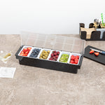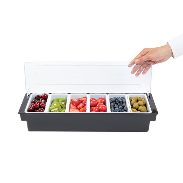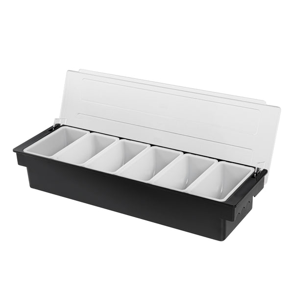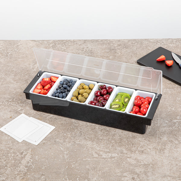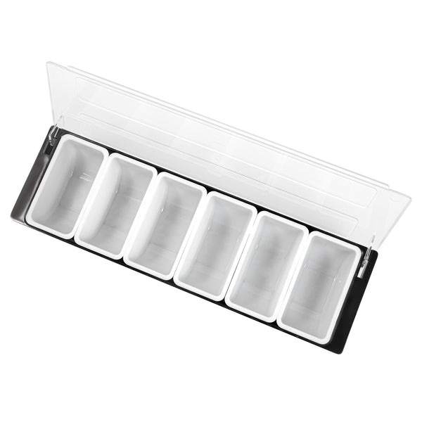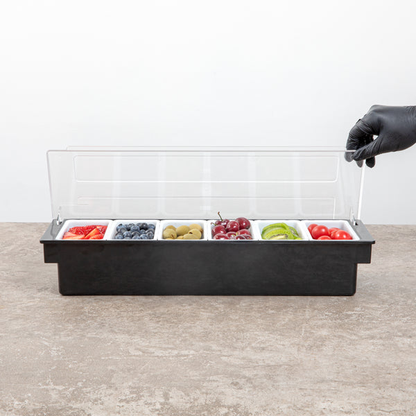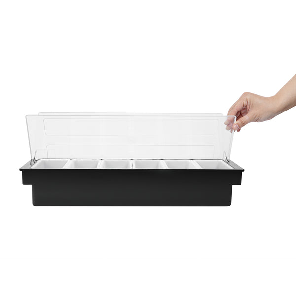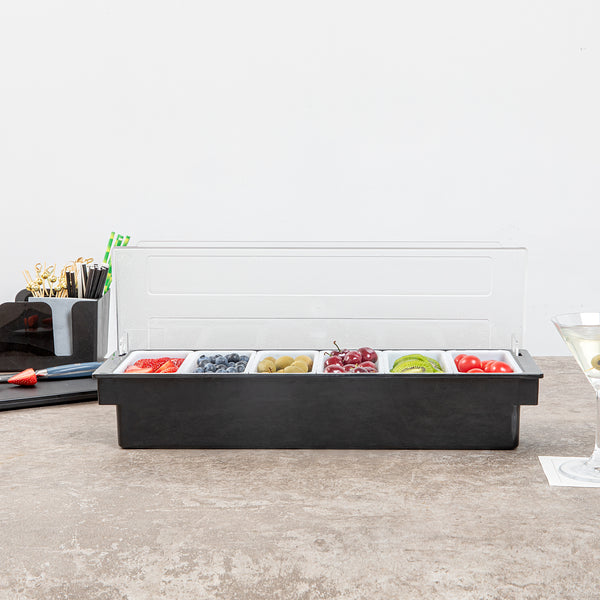 Easily add the final touch to hand-crafted cocktails with our Bar Lux Black Plastic Condiment Caddy. Crafted from high-quality plastic, this garnish tray is durable to maintain its exceptional design for long-lasting use at your bar, restaurant, buffet, or other foodservice establishment. Featuring 6 compartments, this condiment caddy is excellent for storing and organizing a variety of garnishes in one location for easy access. The 6 inserts of this condiment tray are conveniently removable for an effortless way to clean and refill each compartment during busy shifts. This bar condiment holder includes a clear cover that allows bartenders to quickly identify condiments inside the caddy. The hinged lid of this food storage container provides you with an effortless way to open the caddy and grab garnishes to streamline your drink preparation process. Measuring 19.5 inches in length by 6.25 inches in width by 3.75 inches in height, this bar caddy can contain a total of 90 ounces. Shipped in a 1 count box.