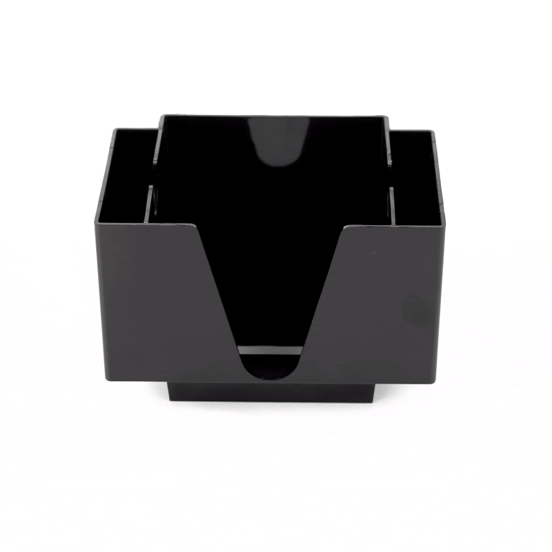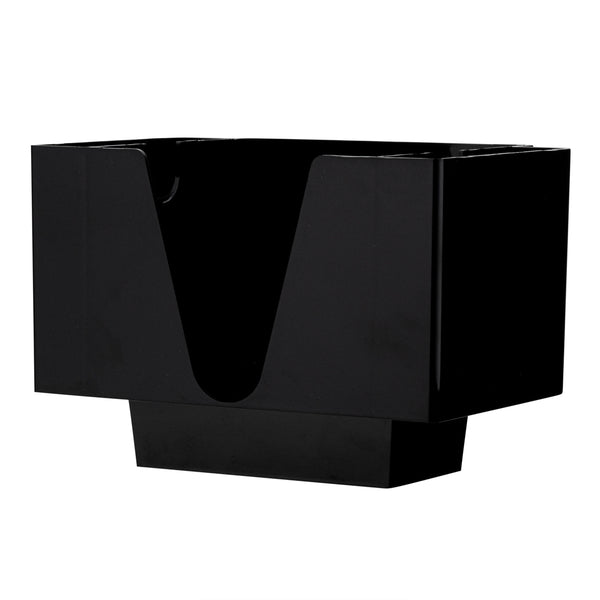 Provide guests with utensils, condiments, and napkins all in one place using our Bar Lux Rectangle Black Plastic Condiment Caddy / Napkin Holder. Equipped with 3 individual compartments, this condiment caddy is meant for multipurpose use at your restaurant, hotel, or catered events. The stylish black finish brings a sleek and simple look to tabletops at your establishment. Designed with a built-in napkin holder at the center, this napkin caddy provides guests with convenient access to napkins. The 2 compartments on the sides of this dispenser can easily hold forks, knives, straws, or condiments. Great for avoiding accidents, the sturdy base of this napkin holder provides superior stability on all surfaces. This condiment caddy is constructed with high-quality plastic and is strong and sturdy to withstand daily use at your restaurant. This napkin caddy measures 7.9 inches in length by 5.5 inches in width and 5.7 inches in height. Shipped in a 1 count box.