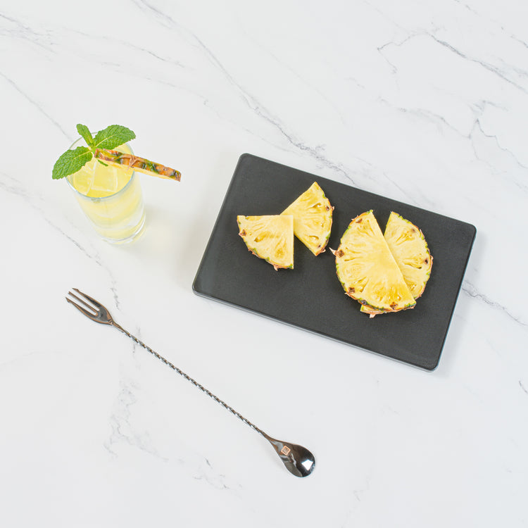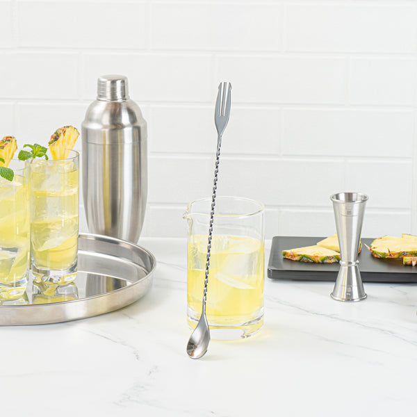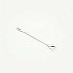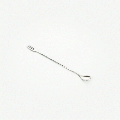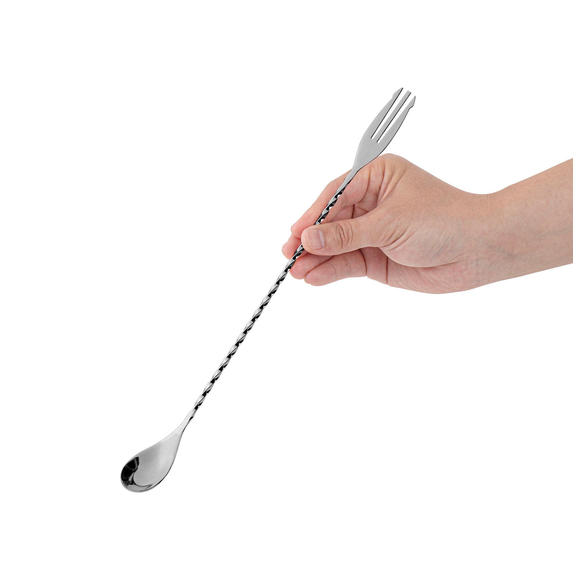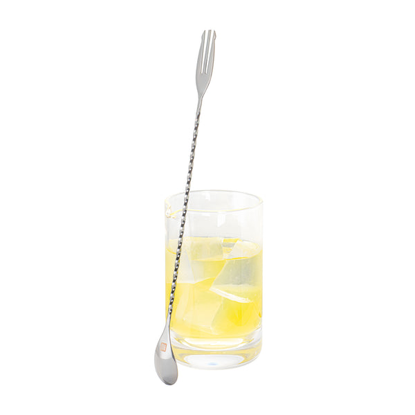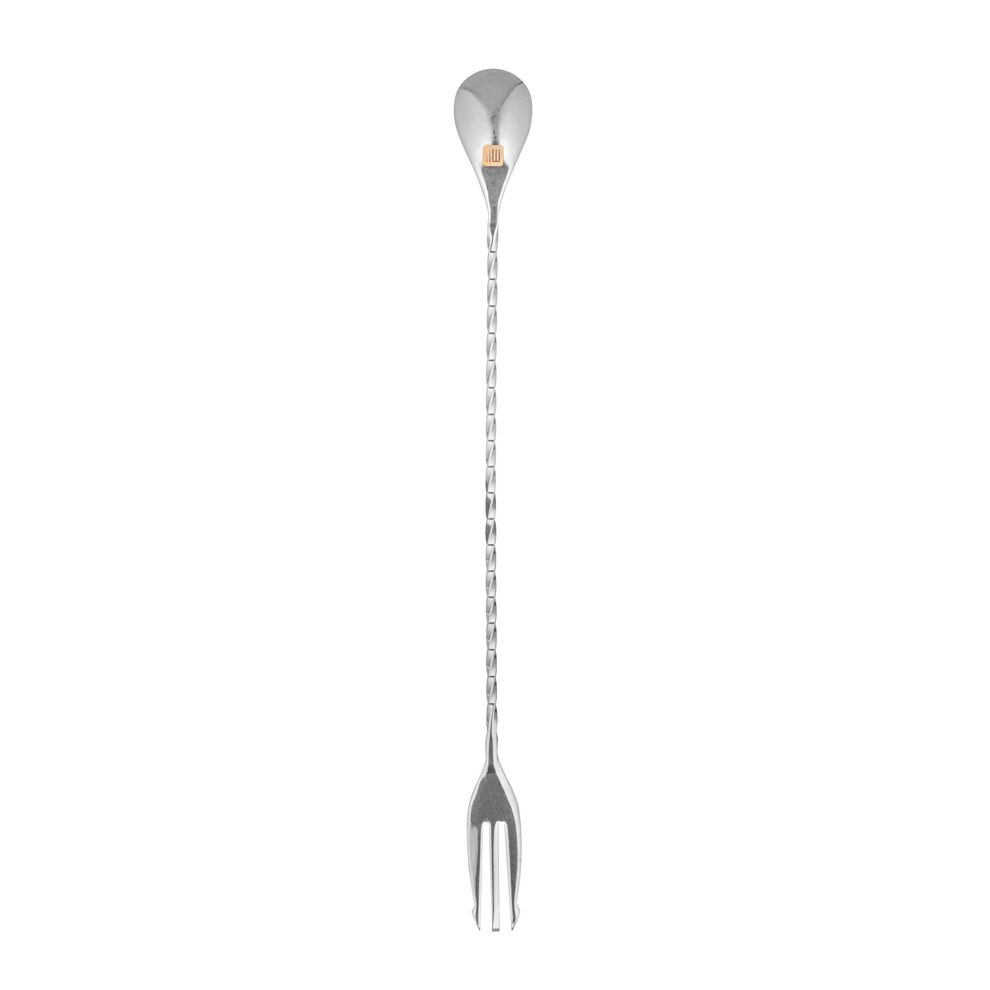 Elevate your cocktail game with our Bar Lux Black-Plated Stainless Steel Trident Barspoon. This versatile cocktail spoon features a 3 prong fork tip, allowing you to garnish and serve with finesse. The graceful twirled design of this cocktail stirring spoon not only enhances the visual appeal but also ensures practicality, offering a comfortable grip for expertly stirring beverages. Featuring an elegant black plating, this metal mixing spoon is the perfect tool for an upscale bar. With an elongated twirl design, this mixing spoon serves a dual purpose, acting as a conduit for spill-free pouring and safeguarding against any unwanted messes during the cocktail-making process. Crafted from stainless steel, this barspoon is built to last, maintaining its integrity even through rigorous daily use. This steel barspoon holds 2.5 milliliter of liquid and measures 12 inches in length. Sold in a 1 count box.